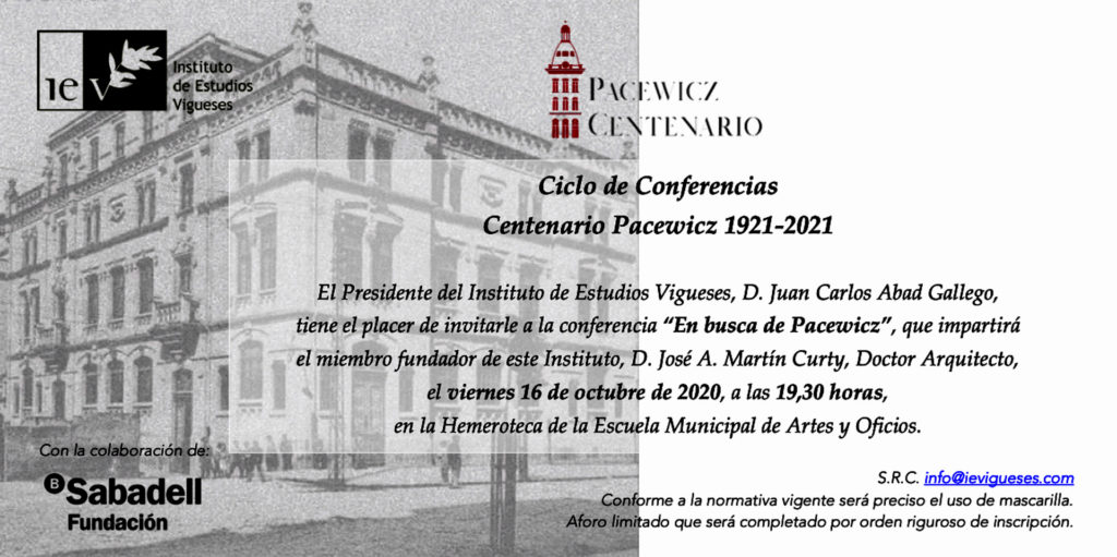 El arquitecto vigués José Antonio Martín Curty, miembro fundador del Instituto de Estudios Vigueses, comenzará un ciclo de conferencias sobre el arquitecto Michel Pacewicz con motivo del centenario de su fallecimiento. La conferencia inaugural será el próximo viernes, 16 de octubre de 2020, a las 19.30 horas, en la hemeroteca de la Escuela Municipal de Artes y Oficios, en el número 5 de la Avenida García Barbón.