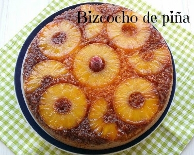 Preparamos la masa del bizcocho. Para ello, mezclamos todos los ingredientes menos las rodajas de piña, hasta que estén formen una masa sin grumos, bien integrada. Ponemos a escurrir sobre un colador las rodajas de piña.