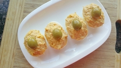 Rellenamos las mitades de clara con esta mezcla, de modo que sobresalga un poco del hueco. Decoramos con una aceituna rellena de anchoa.