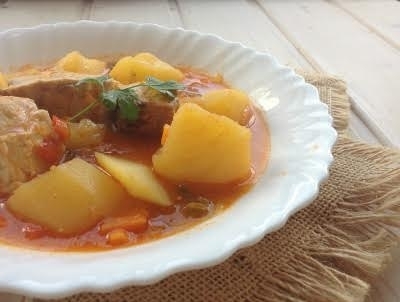 Mientras tanto, pelamos las patatas y las cascamos, para que ayuden a espesar la salsa. Las añadimos a la olla, cubrimos con caldo de pescado, sazonamos al gusto, y dejamos cocer unos 25 minutos, a fuego muy suave.