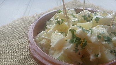 Cortamos las patatas en trozos gorditos. Aliñamos las patatas con la salsa, y espolvoreamos con perejil picado. Metemos a la nevera al menos una hora antes de servir.