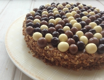 A la hora de servir, despegamos la mousse con ayuda de un cuchillo caliente (yo lo pongo un ratito en una taza con agua caliente) que pasaremos por los bordes del molde y decoramos a nuestro gusto. En este caso, utilicé granillo de almendra para los laterales y bolitas de galleta cubiertas de chocolate para la parte superior.