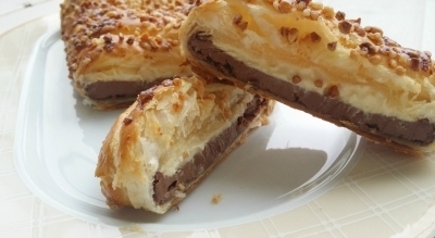 Precalentamos el horno a 180ºC. Pintamos el hojaldre con huevo batido y colocamos por encima el crocanti de almendra.