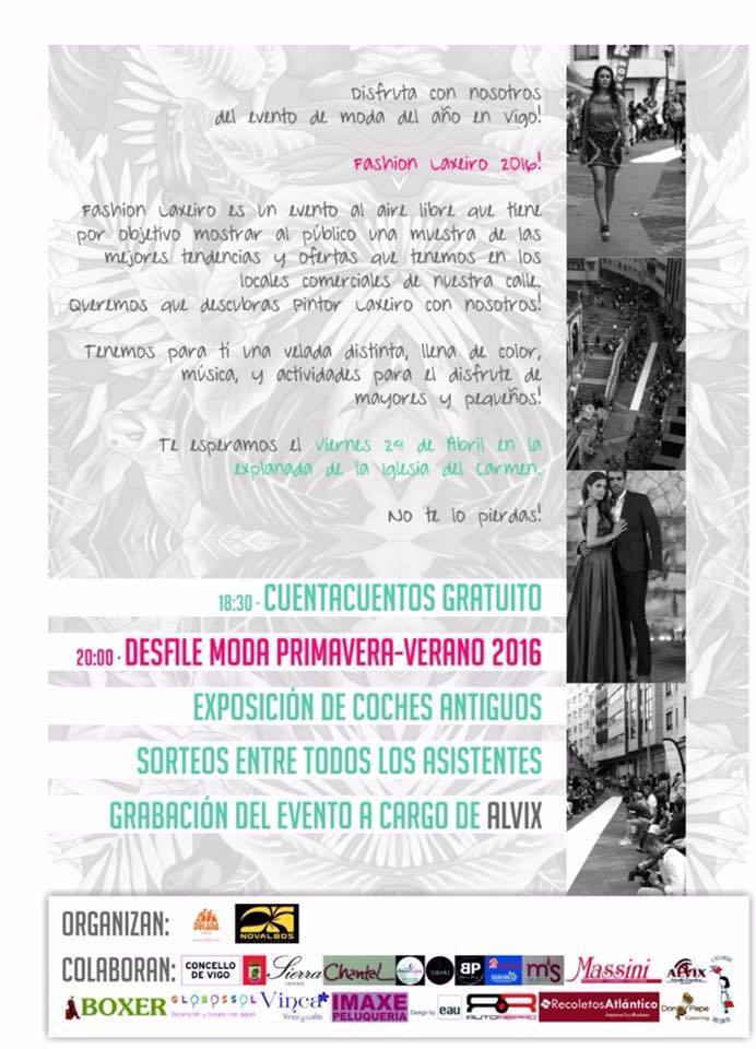 El presentador del evento será Roque Soto (periodista, escritor, freelance y blogger). Fashion Laxeiro obtuvo en su primera edición, celebrada en agosto de 2015, un importante éxito de público y una amplia participación del comercio de la zona Traviesas. Según destacan desde la organización, este año esperaran una mayor afluencia, ya que es gratis (no se cobra entrada), es la segunda edición y la consolidación de la convocatoria debido a las favorables críticas tanto por parte del público como por los medios de comunicación y las redes sociales.