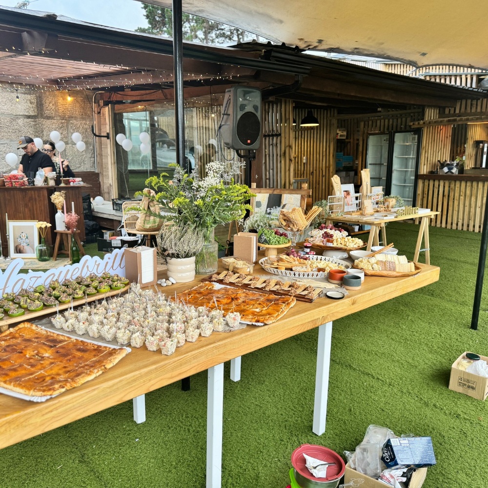 Sus mesas elegantemente decoradas con centros florales y vajillas, donde los platos principales, como el pulpo a la gallega o el lacón con grelos, se presentan con una estética moderna. Los cócteles al aire libre, con estaciones de mariscos y vinos de la D.O. Rías Baixas, son un sello distintivo que enamora a los asistentes.