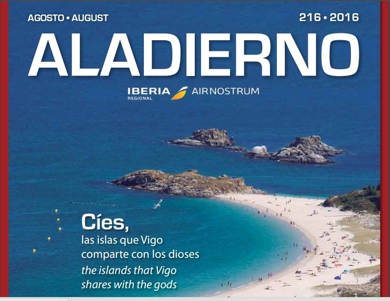 «Las Islas Cíes, de Vigo, ocupan nuestra portada como reivindicación de unos fascinantes enclaves que, cual dragones de un relato de Cunqueiro, emergen de las profundidades como guardianes de la ría. Su aire de misterio está en consonancia con la riqueza de su biodiversidad y sus aguas transparentes que acarician suaves y blancas arenas de playas que han sido reconocidas internacionalmente como una de las mejores del mundo». Con estas palabras, Carlos Bertomeu, presidente de Air Nostrum, describe en el editorial A Bordo de la revista uno de los dos destinos -el otro es Extremadura- que protagonizan este mes de agosto la revista Aladierno.