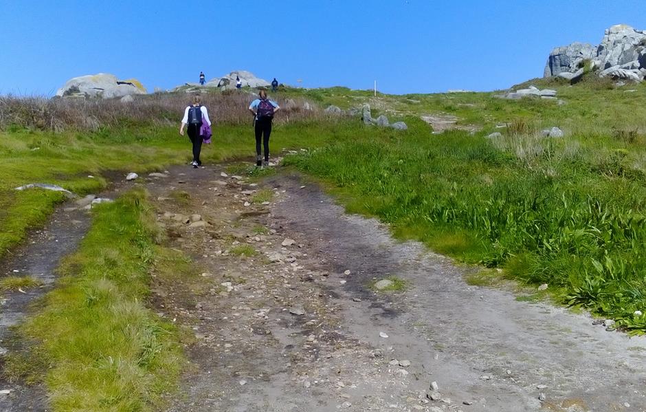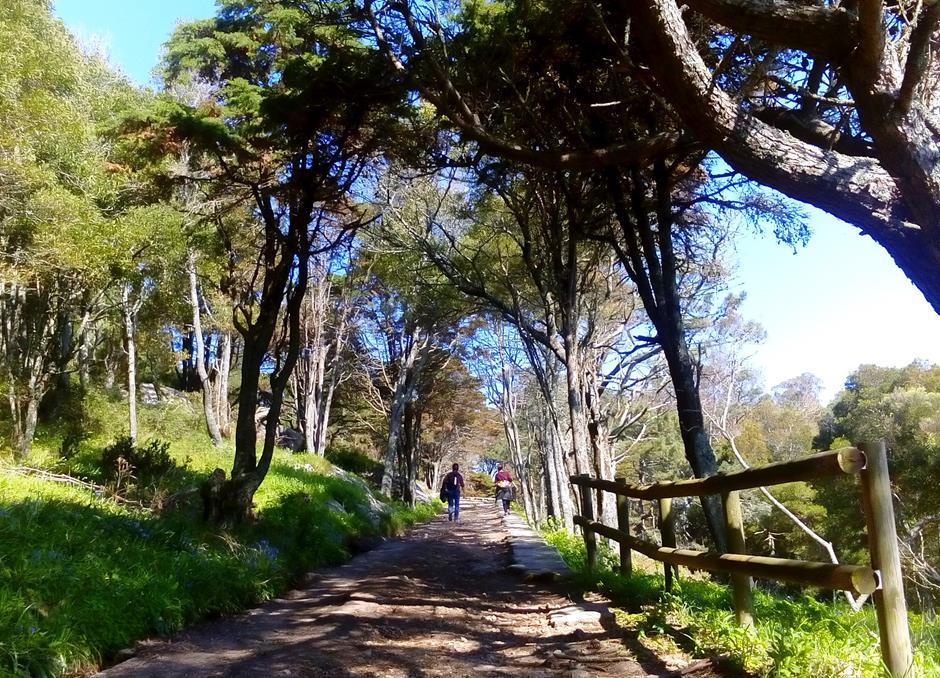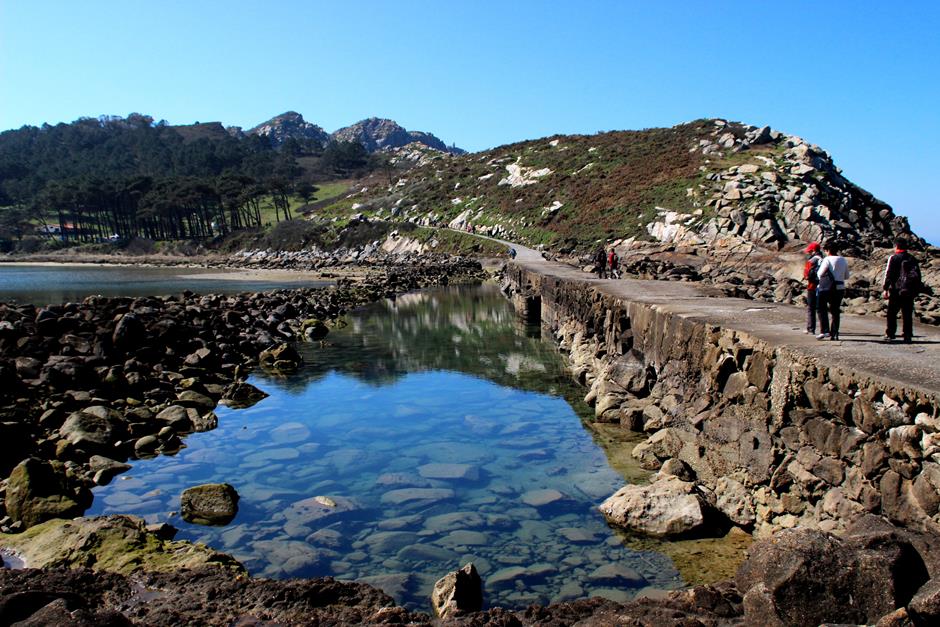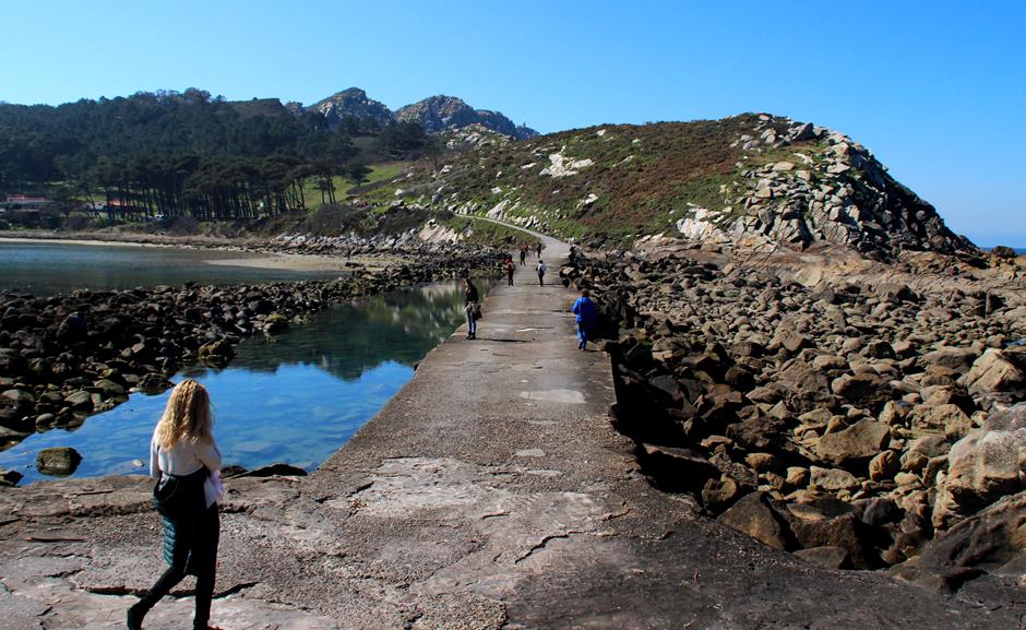 Llegar al punto más alto se hace obligatorio y es más que recomendable. Se pasa por la espectacular rareza que constituye el Lago dos Nenos. Por el sendero los carteles advierten que está prohibida la pesca y, un poco más después, se puede observar un banco de peces que se alimentan en las aguas cristalinas. Llega el momento del camping, un nuevo restaurante y los primeiros miradores sobre la isla. Es justo antes de la desviación, uno sigue una senda costera y otro será el camino al Faro. Cada uno a su ritmo, los excursionistas comienzan a serprentear entre árboles, es donde crecen con mayor vigor protegidos por las cimas graníticas de los vientos atlánticos. Un camino que constituye un manual acelerado de vegetación gallega en altura en poco más de 170 metros de desnivel.