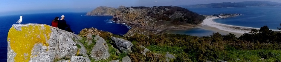 Los rayos golpean la arena de Rodas. La magestuosidad y longitud de la playa es necesario vivirla en primera persona. Es más larga de lo que se intuye desde los miradores de la Ría de Vigo. Es más bella de lo que permite imaginar la mente. Hace sol y la atmósfera está limpia, por lo tanto el azul es impecable. Buen día para comenzar a caminar, buena elección para hacer la ruta hasta el Faro de Cíes, punto más alto que dispone de senderos. Es primavera, el sol elimina el frío y el aire norteño evita el calor.