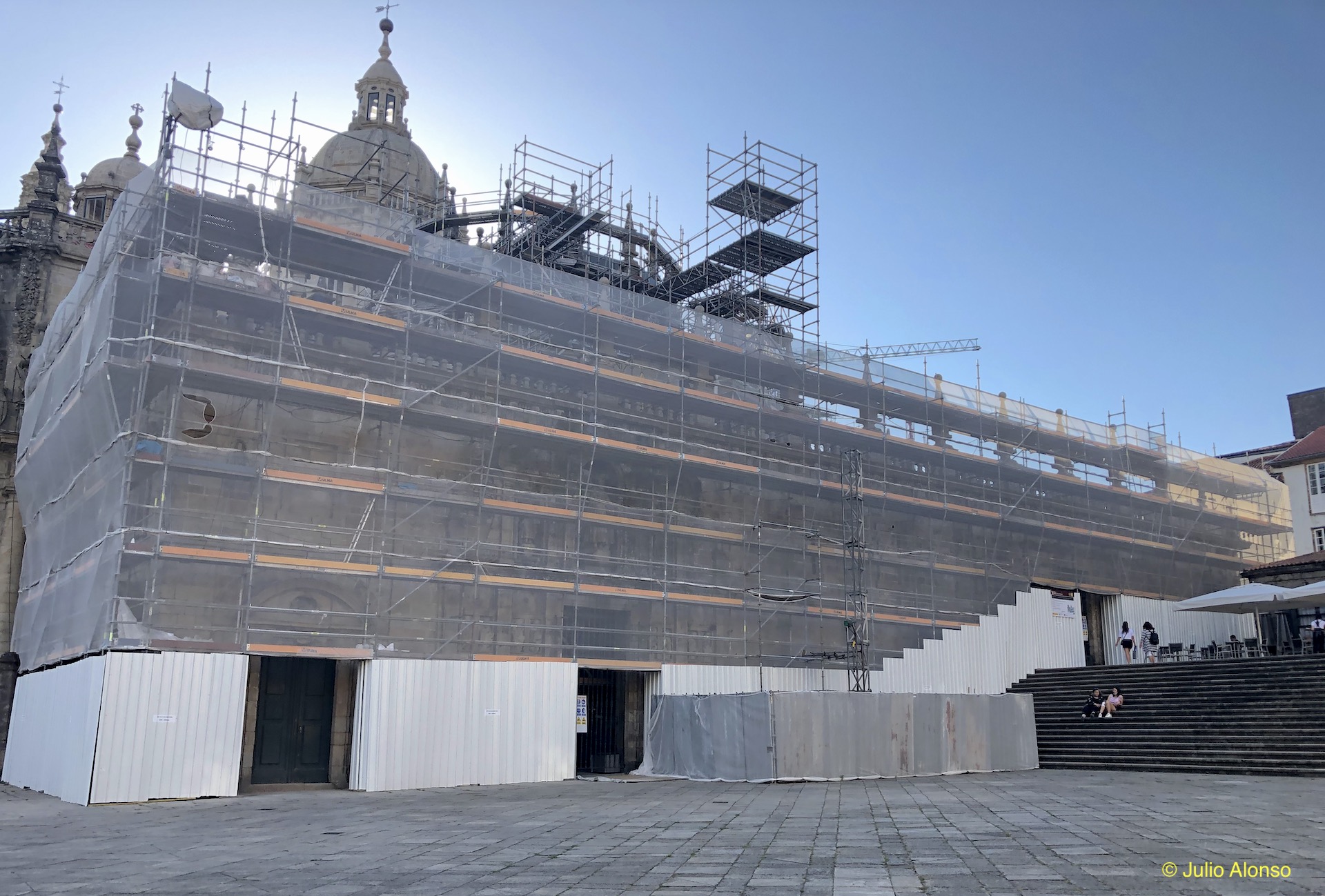 La catedral de Santiago de Compostela está en obras de restauración y los visitantes se ven obligados a guardar largas colas frente a la entrada de Platerías. Algunas partes de la catedral ya están finalizadas, pero otras, como puede apreciarse en esta fotografía tomada en la plaza de A Quintana el día 11 de julio de 2020, aún están tapadas. La Puerta Santa, que aparece en primer término, tampoco se libra de esos trabajos y, lejos de todo su esplendor, permanece cerrada. Entre las vallas y los andamios, la Puerta Santa pasa inadvertida a los ojos de los muy pocos foráneos que visitan la capital compostelana durante estos días.