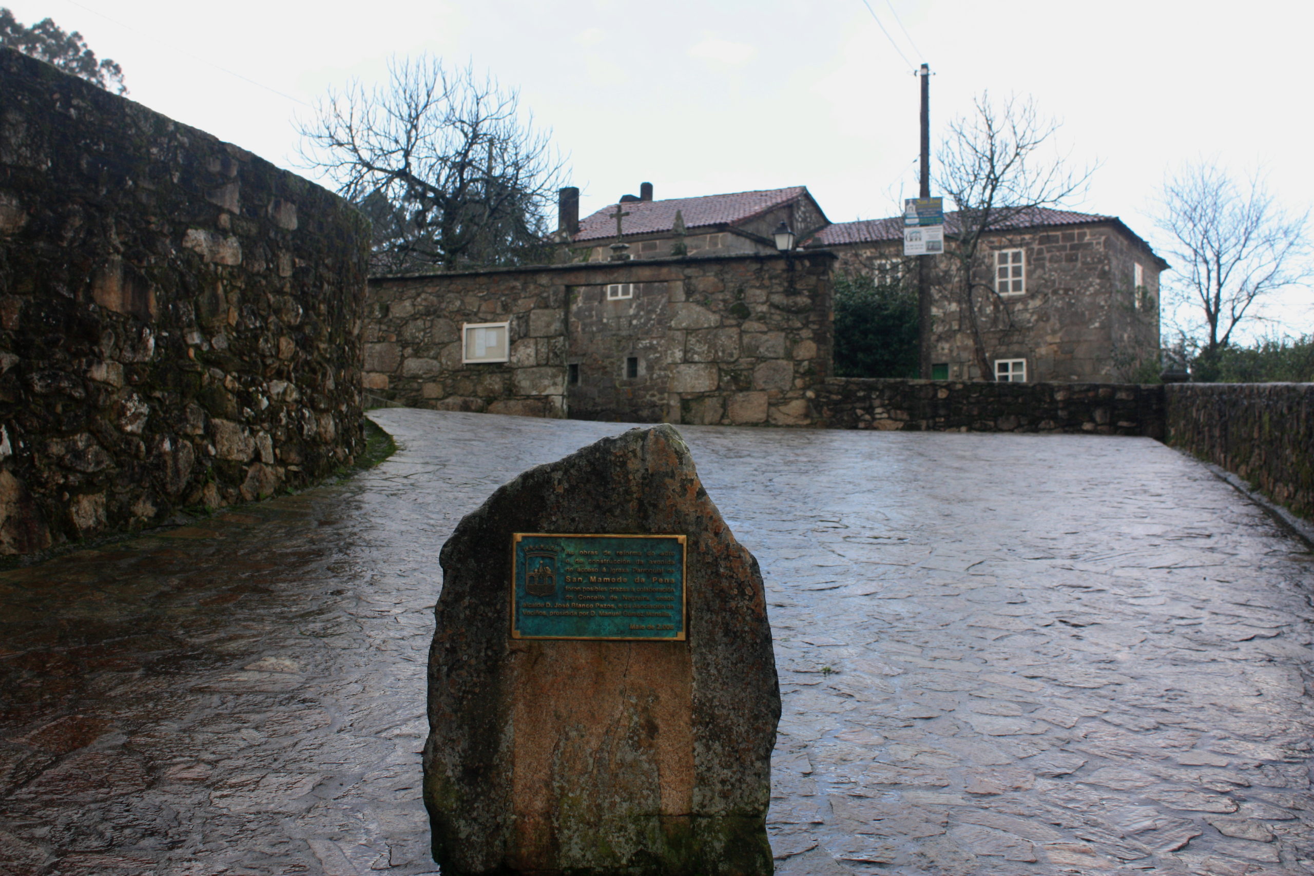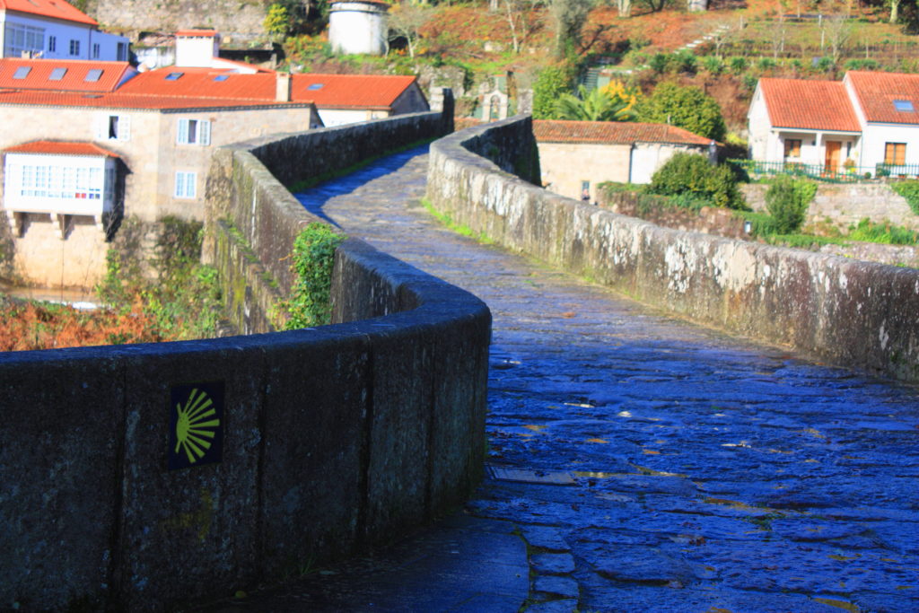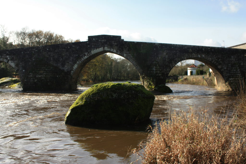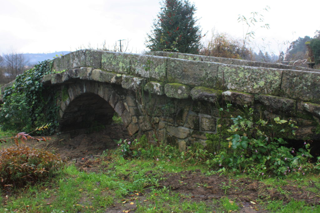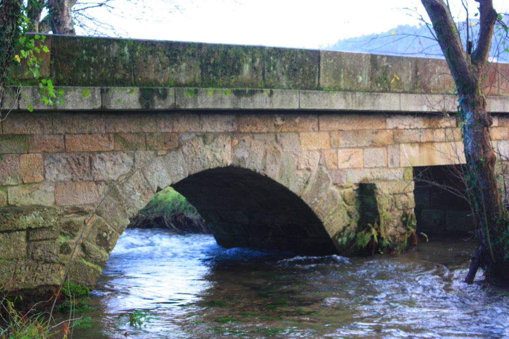 Llego hasta Augapesada. El itinerario me obliga a dejar la carretera para pasar junto al puente sobre el rego dos Pasos, un vado medieval rehabilitado de un solo ojo (km 11,6). Permite atravesar el arroyo, que desemboca en el Sar. Es importante por su antigüedad y ser una parte de la ruta xacobea.