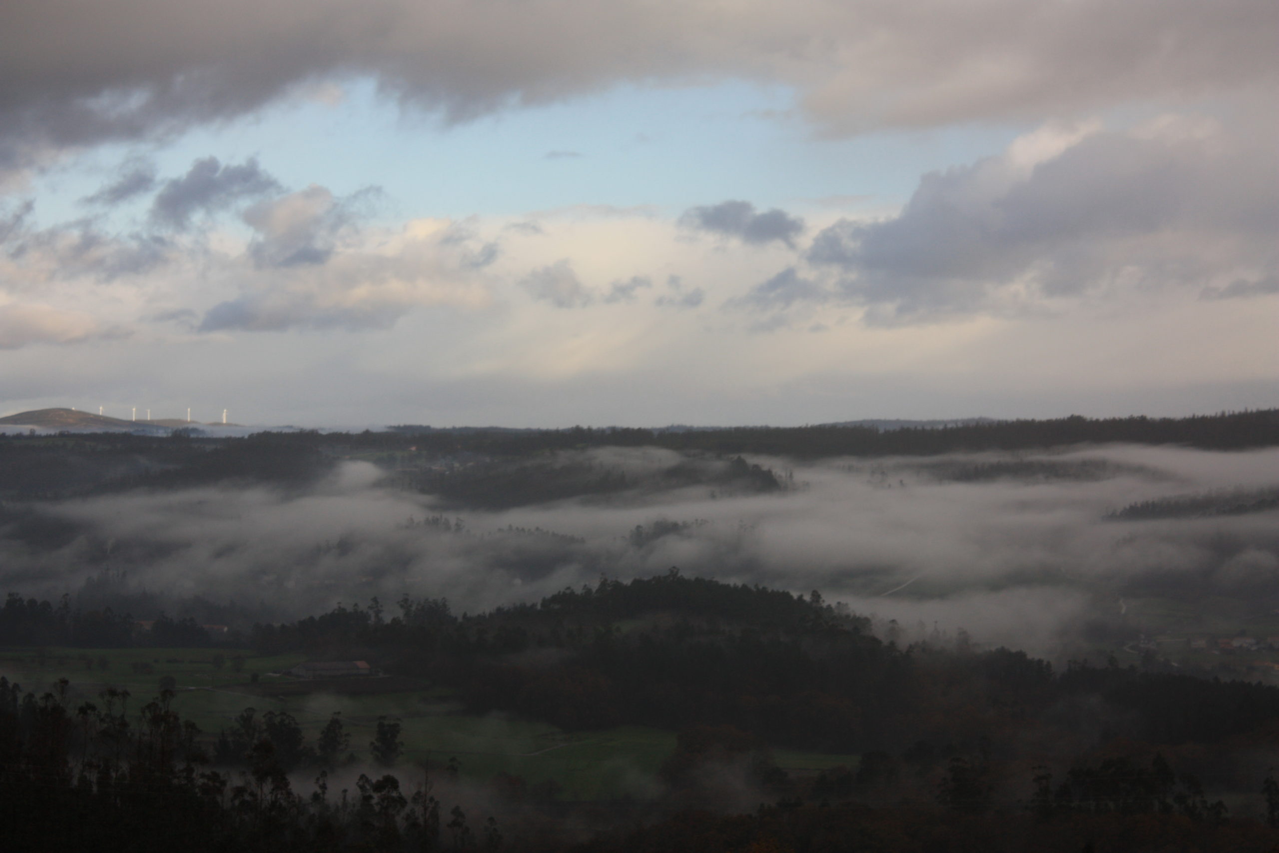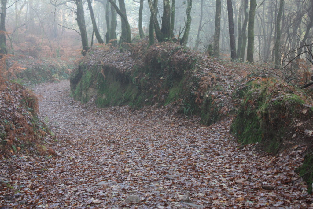 Arropado por el robledal, voy sintiendo los primeros latigazos que me propina la cuesta, que también me deja respirar durante algunos tramos. El primer kilómetros y medio lo hago entre una niebla muy espesa, lo que siempre me recuerda a la Santa Compaña. Las meigas, habelas hailas…