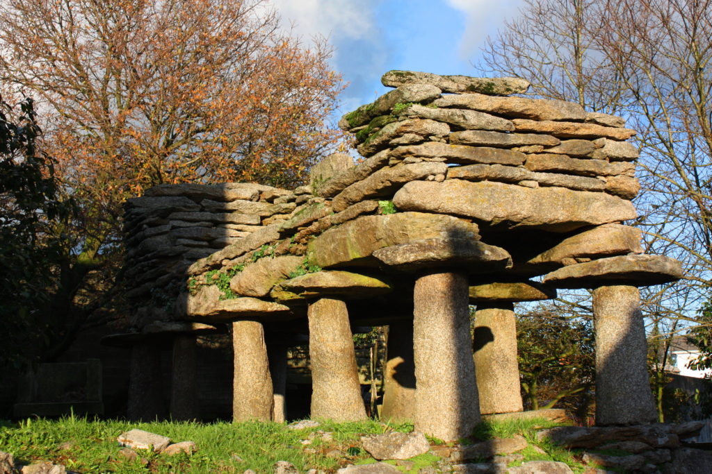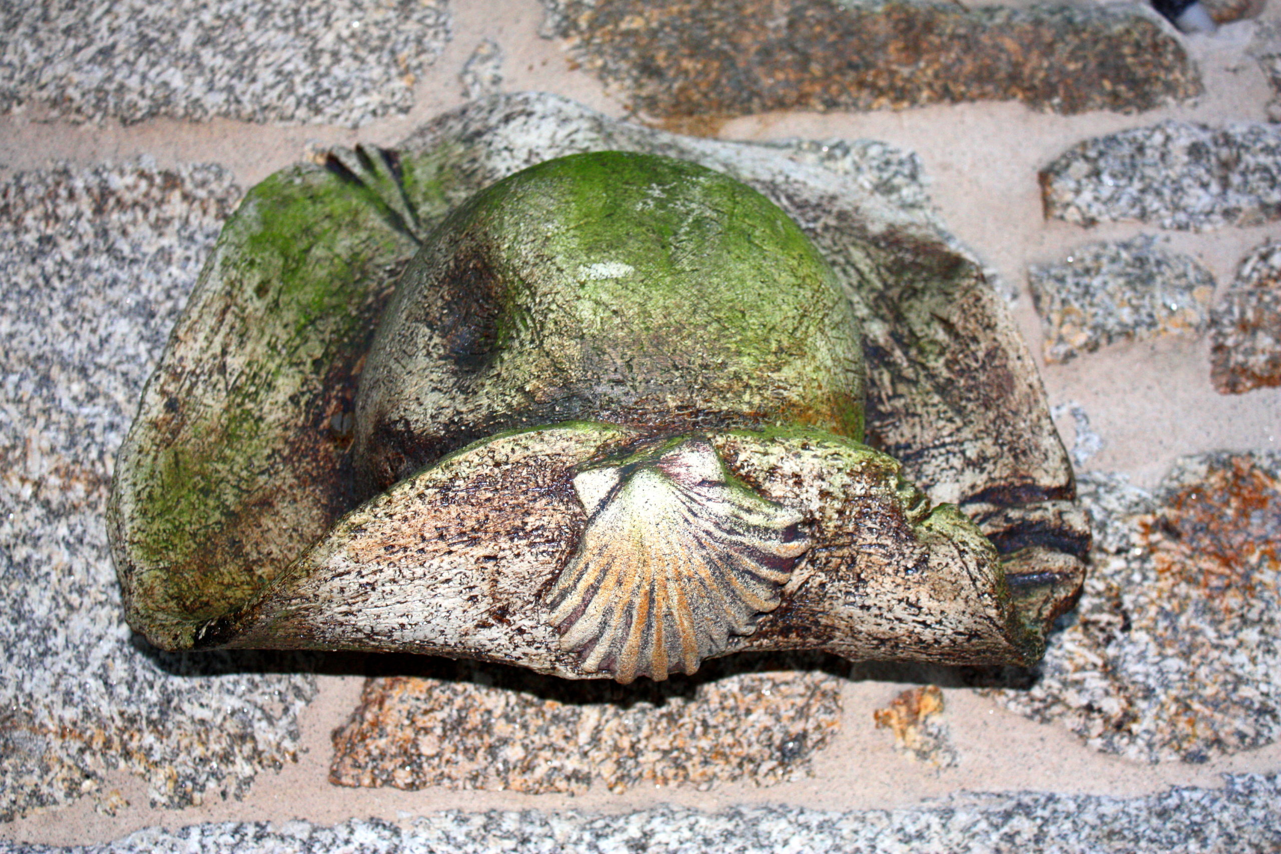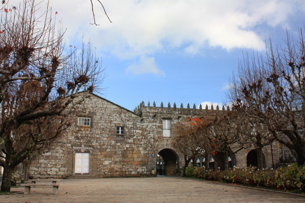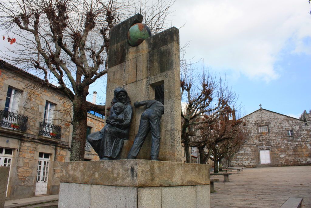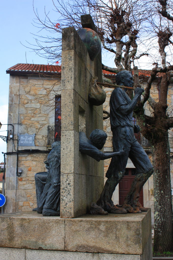 Otro pazo en mi camino es el de Cotón, una fortaleza medieval que sufre importantes reformas aunque mantiene los cubos de las antiguas murallas enmarcando el edificio. Está vinculado a los Luaces y los Mariño de Lobeira. Una galería de piedra atraviesa la calle principal de la villa, con triple arcada, balaustradas y miradores y une el pazo con la capilla de San Mauro, construida en el siglo XVIII. En la plaza que está delante del pazo hay una figura en homenaje a los emigrantes que tuvieron que partir a buscar fortuna en otras partes. Llama mi atención porque tiene dos partes que se pueden interpretar de diferente manera.