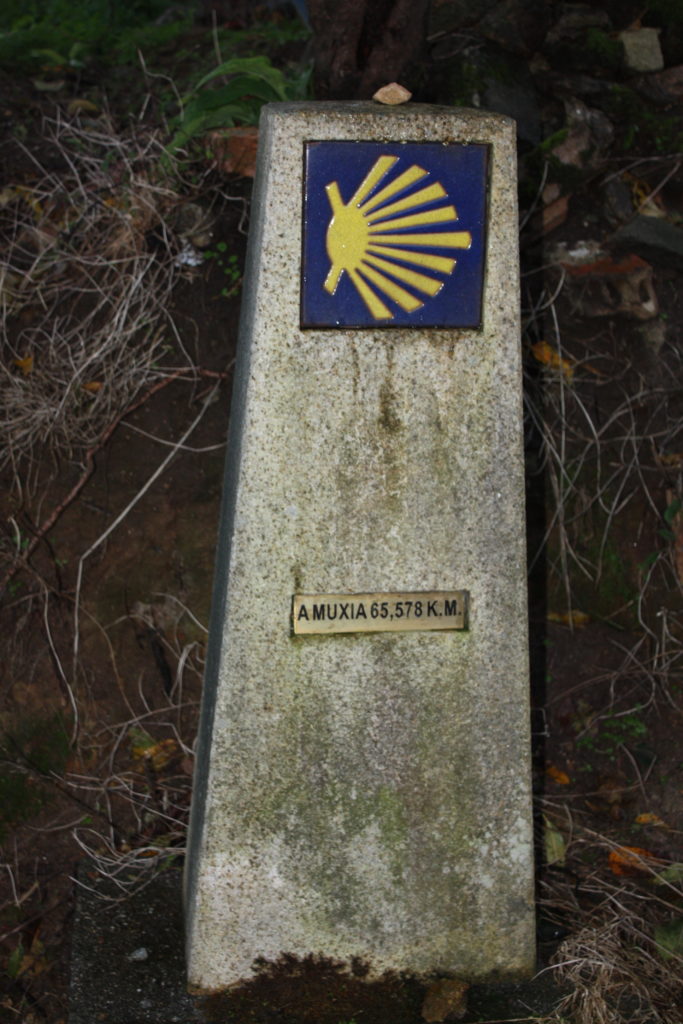Pronto llego al robledal de San Lourenzo y me encuentro el primer mojón con la típica vieira y la distancia que me queda por recorrer hasta Muxía: 86,337 kilómetros. Mi intención es seguir después hasta Fisterra, al contrario de lo que recomiendan algunas guías.