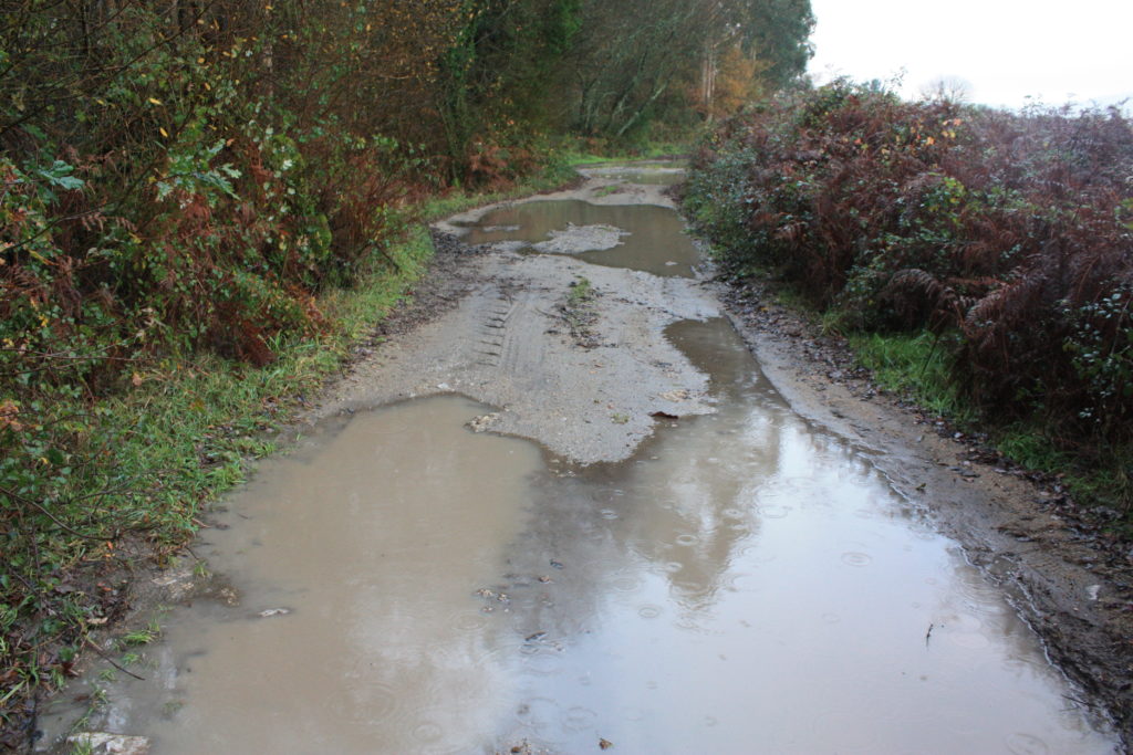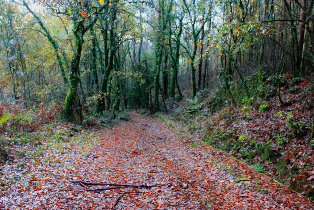Una senda ceñida, todo un regalo tan cerca de la ciudad, nos aproxima hasta la pista que conduce a Sarela da Baixo donde, si el día está despejado, veremos por última vez la catedral compostelana.