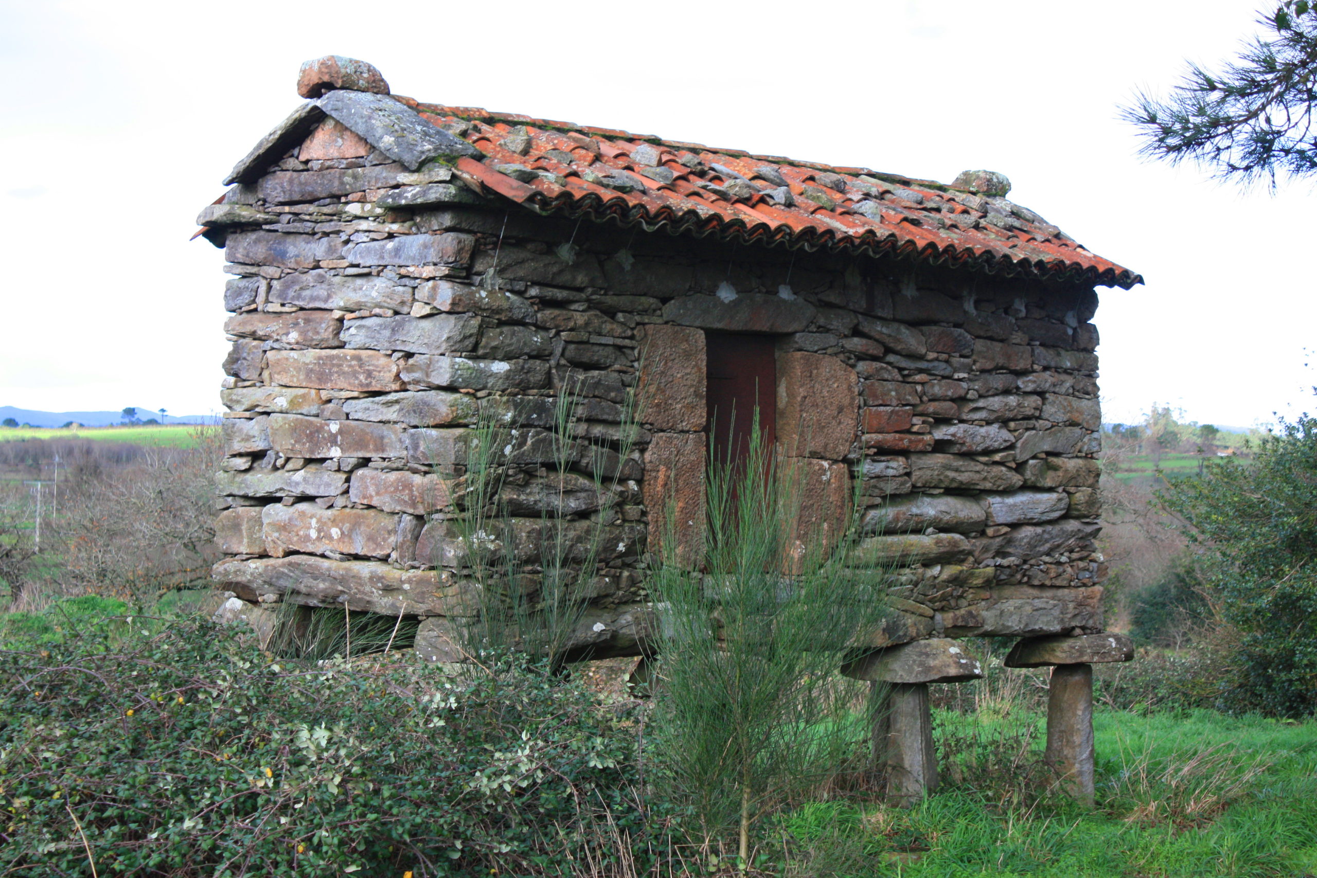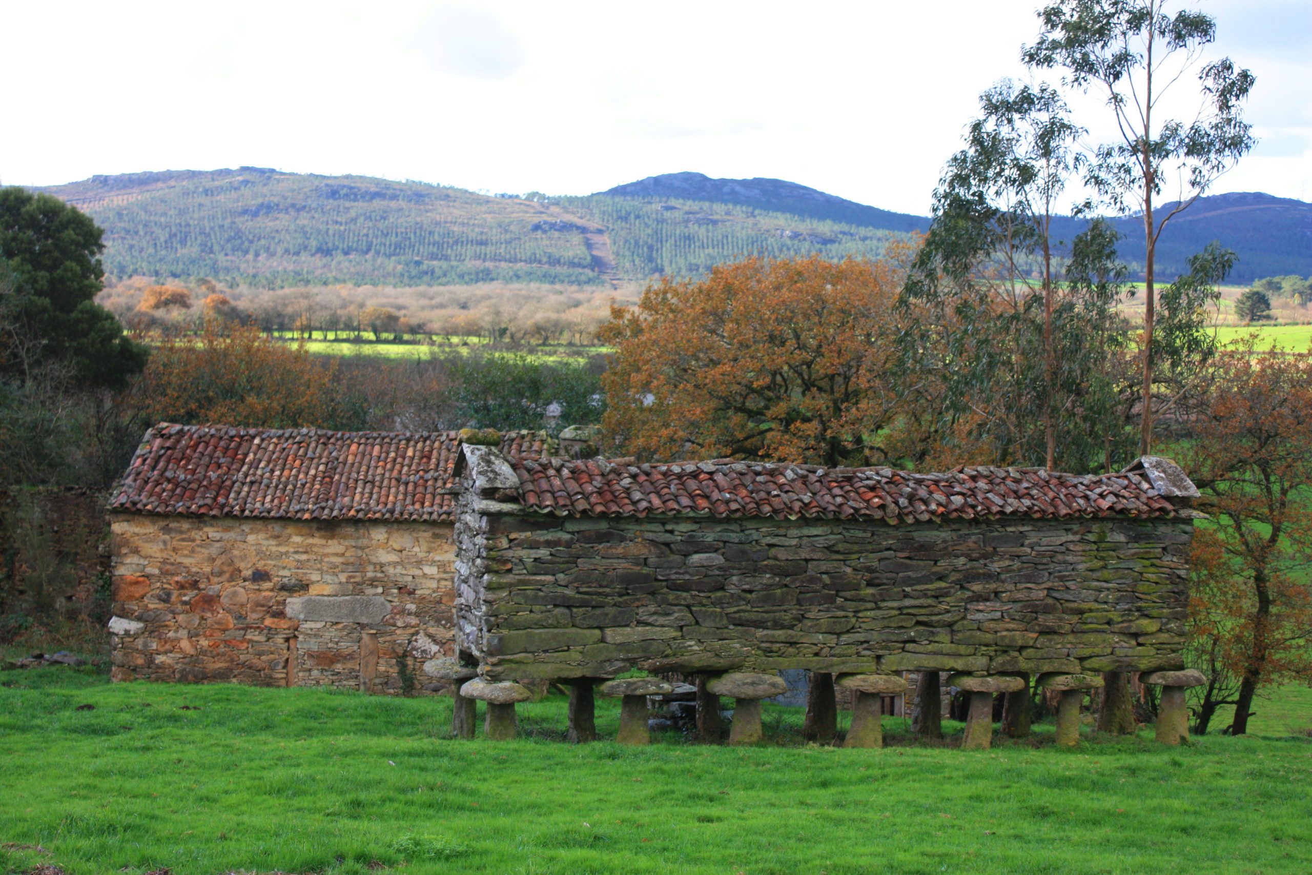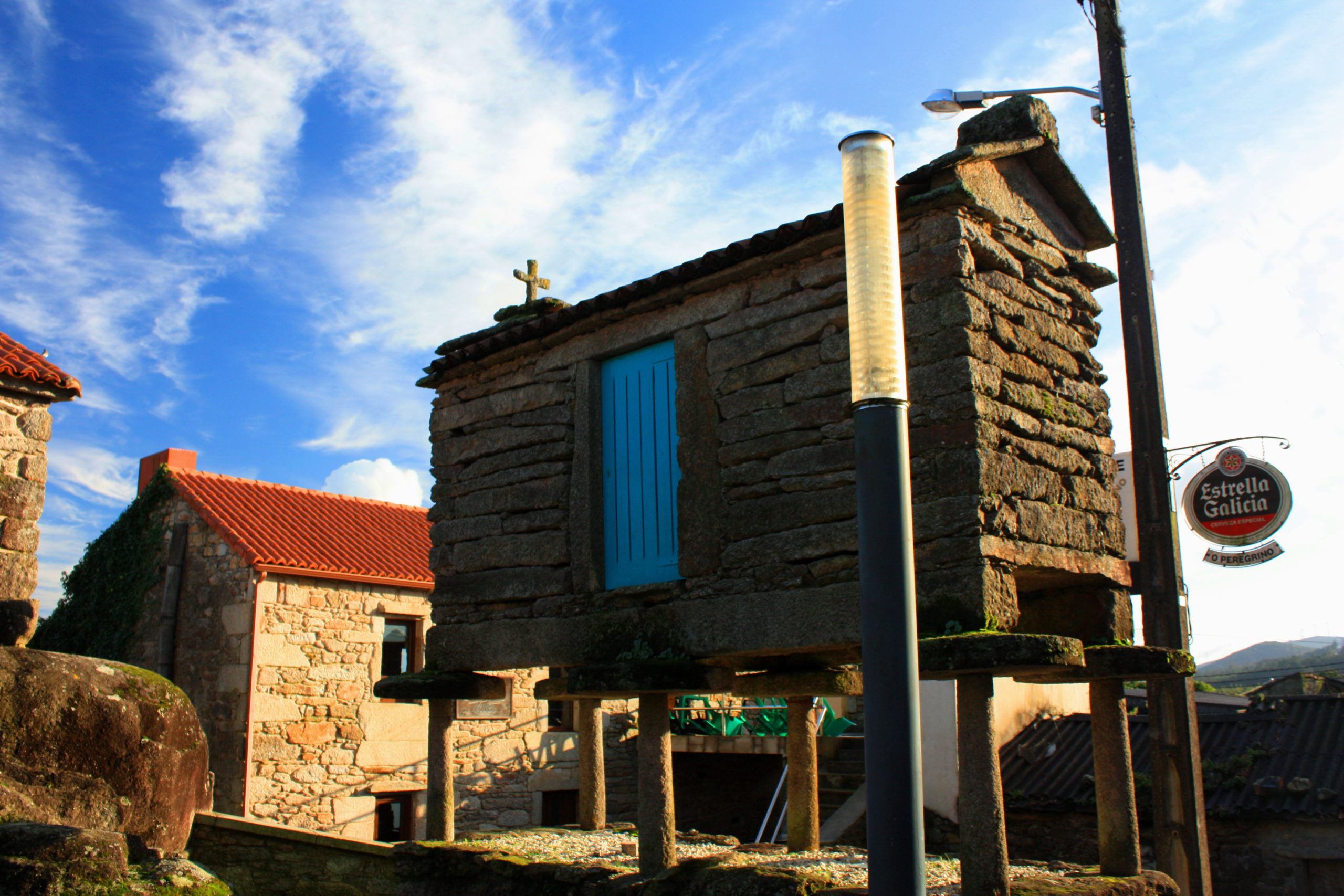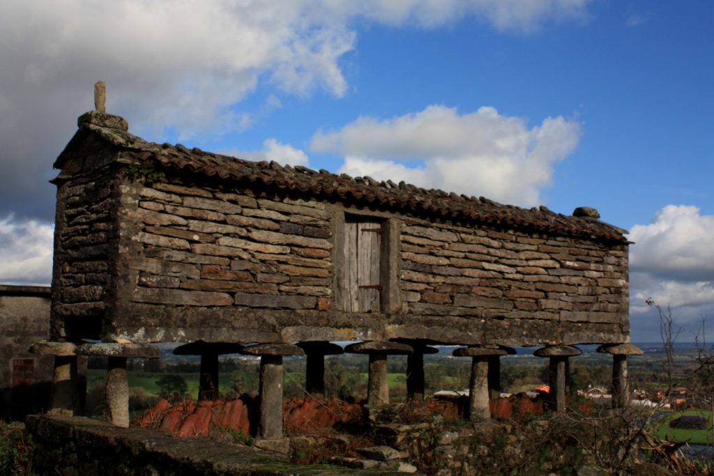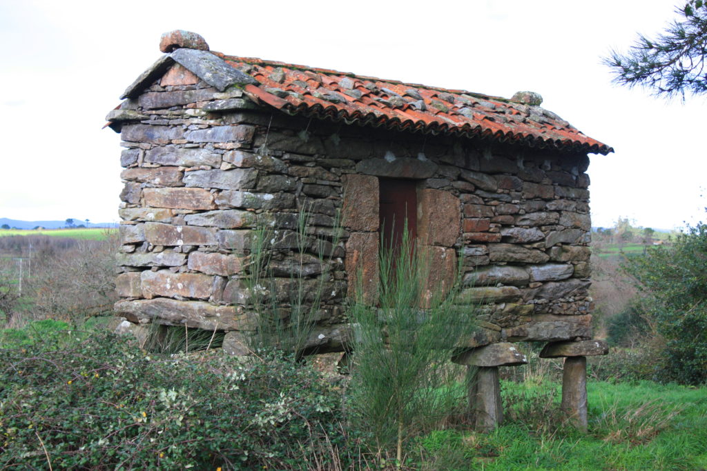 En Vilar do Castro me encuentro con unos bonitos hórreos, mientras sigue la dura subida al Monte Aro, desde donde habrá unas espectaculares vistas del embalse de Fervenza, construido en los años sesenta. Hay unas flechas de dudosa autoría que invitan a tomar un camino hasta Lago dando un rodeo innecesario. También en Campo Valado hay hórreos antiguos y alguna casita labrega restaurada a la antigua usanza. También un perro grande que me acecha.