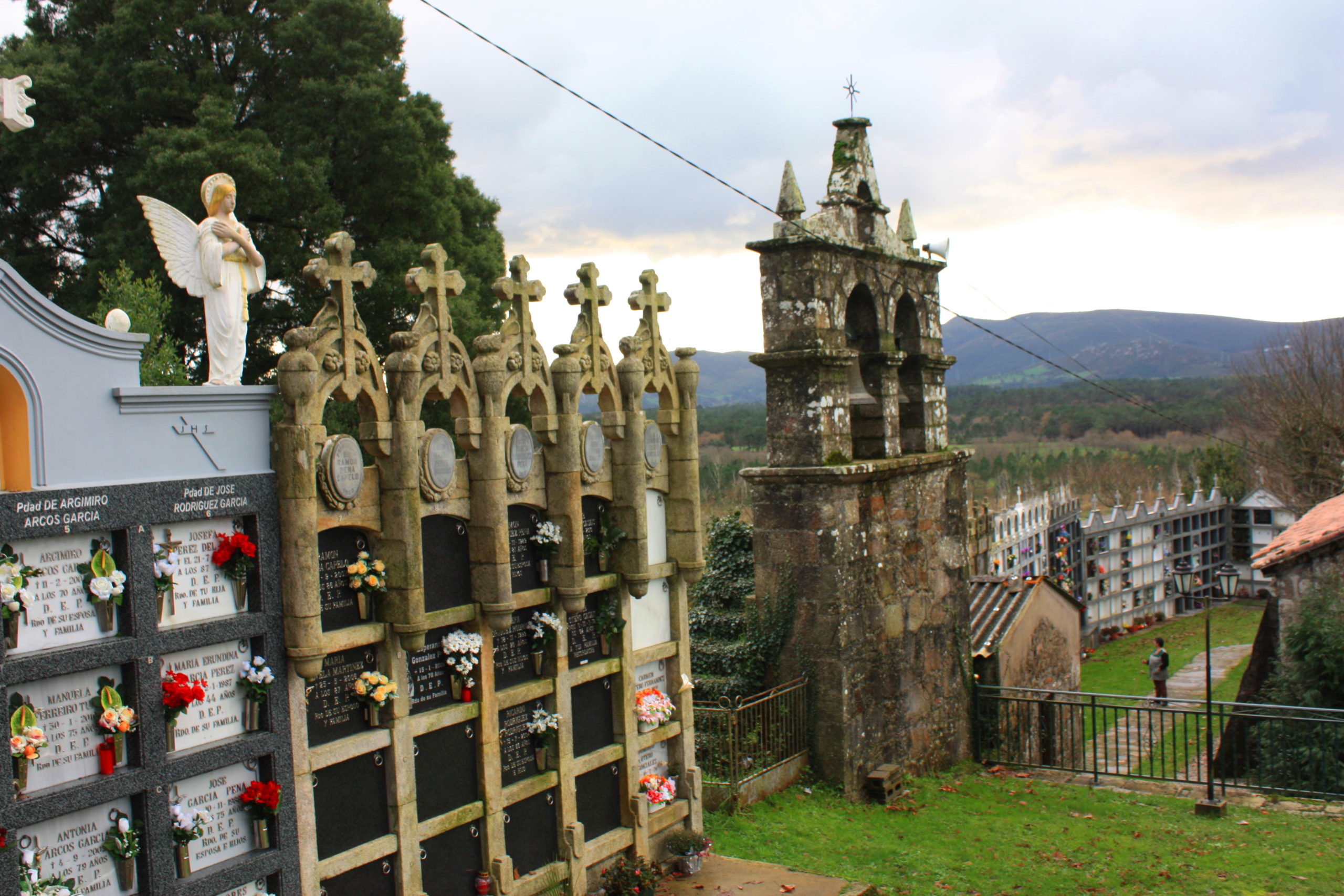 También el cementerio de San Cristovo de Corzón llama mi atención pues empiezo a ver los campanarios separados de la iglesia, tan comunes en esta zona. La iglesia situada en el centro del camposanto y el campanario en un lateral con unos llamativos ornamentos en los nichos laterales.