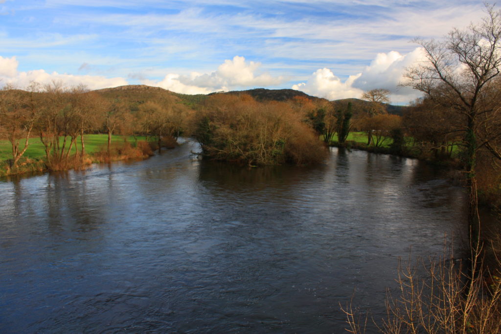 Antes de cruzar el río Xallas por un puente del siglo XVI, aunque reformado posteriormente, me detengo para sacar esta foto que divide los municipios de Mazaricos y Dumbría. Lo cruzo y bajo al nivel del río para sacar la foto del lado interior del puente. El Xallas, con sus 65 km de largo, atraviesa el Monte do Pindo y se precipita en una caída prácticamente libre, de algo más de 100 metros, a la ría de Ézaro, frente al cabo Finisterre, en el océano Atlántico.