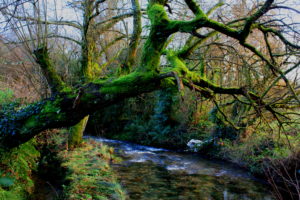 Busco la salida para mañana, en la siguiente etapa, y en la salida del pueblo veo este bonito arroyo que separa la etapa de hoy de la del día siguiente. El verde del musgo es muy llamativo y tengo que tener cuidado al cruzarlo porque está realmente resbaladizo.