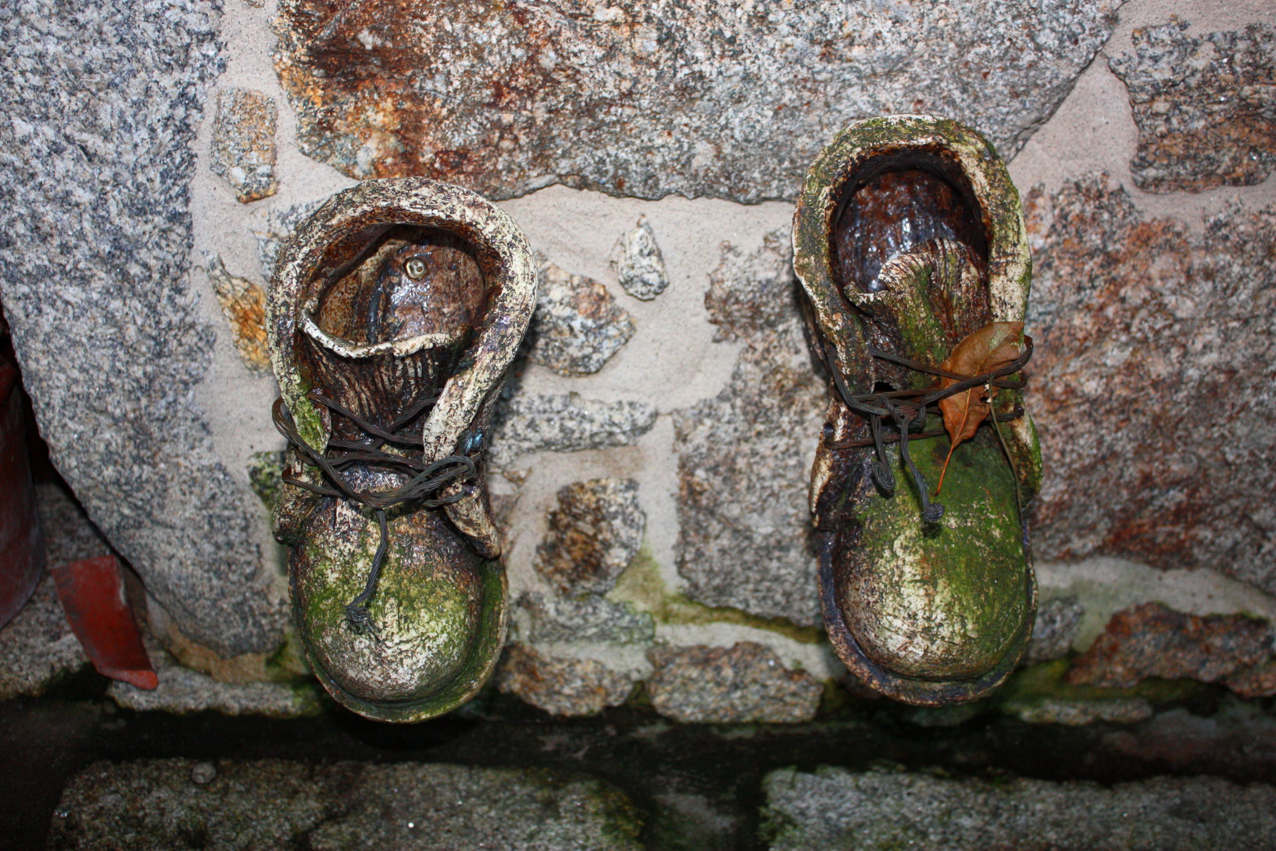 Al final de éste, hay una vieja cruz y el mojón desde el que partir en unas horas. Me vuelvo, que ya empiezo a tener hambre así que en el pueblo busco para cenar algún bar con menú del peregrino y me encuentro con el bar As Pías, donde tomo una cervecita antes de ir a cenar. Puedo decir que cenamos muy bien, por diez euros. Al salir del bar-albergue-restaurante, descubro en la pared de la entrada este sombrero y, más abajo, las botas de un peregrino, que hacen de este bar un imán para los que, como yo, buscan un lugar donde no se cobre mucho y que esté bien decorado y limpio.