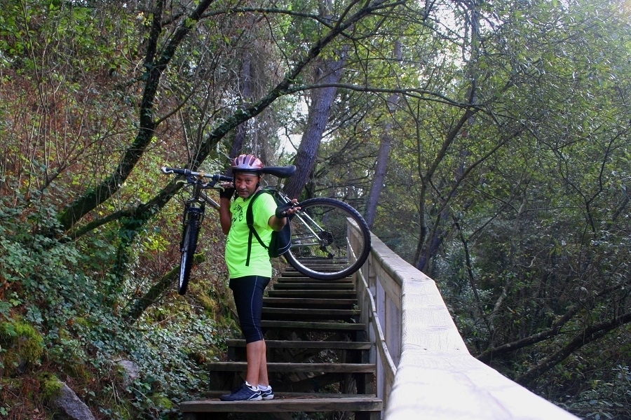 Unos pequeños saltos de agua forman fervenzas ya que estos días atrás llovió mucho y el río baja con bastante agua. Las pasarelas y escaleras continúan y no tengo más remedio que seguir con la bici encima aunque tengo que decir que ya lo sabía porque me informé antes en internet y sabía que el camino era solo parcialmente accesible para bicicletas.