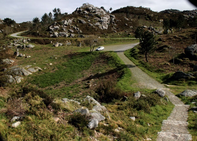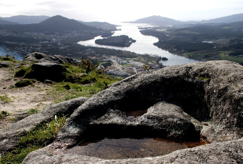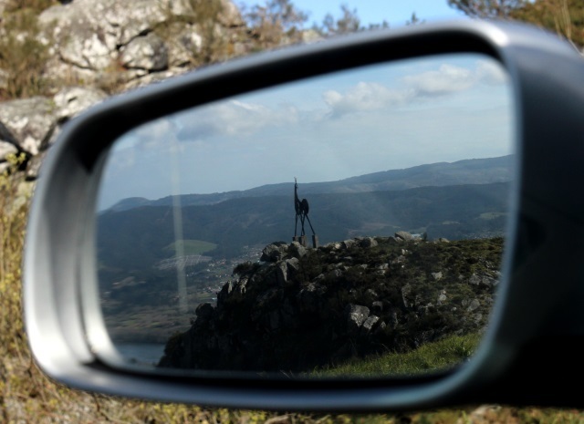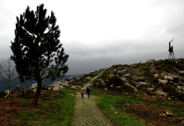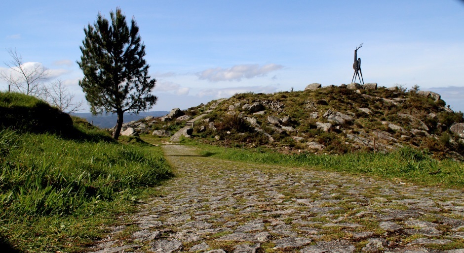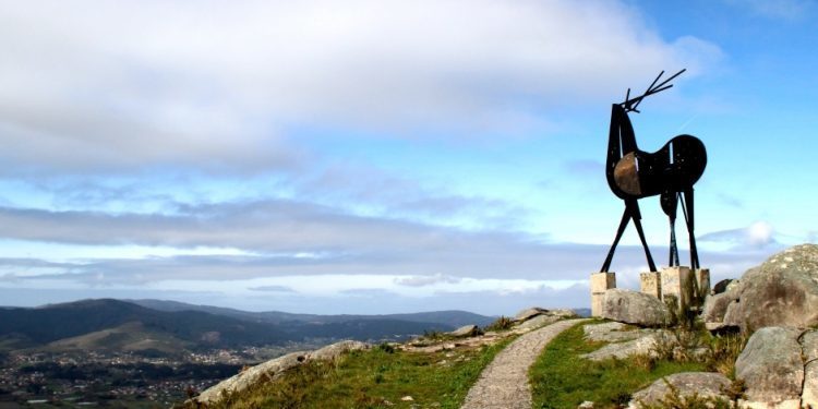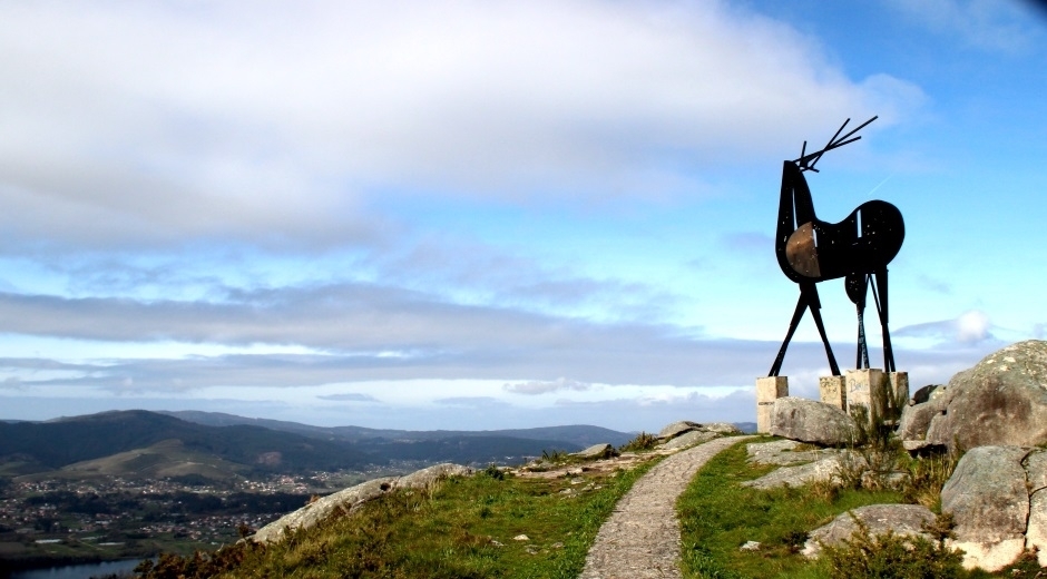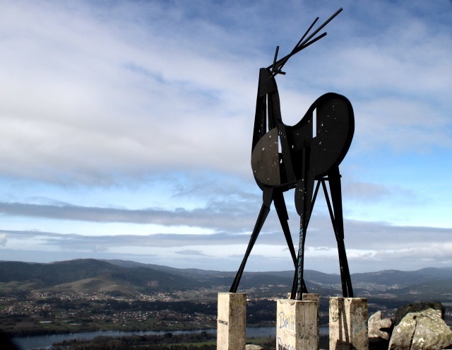 O primeiro é o cervo. Dende a estrada que percorre o norte de Portugal (N-13) pode observarse a figura de metal no medio da montaña. É o elemento característico do lugar e subir ata onde está colocado merece e, moito,a pena. Está no medio da típica montaña granítica deste lugar da Península Ibérica. A súa situación é un auténtico balcón sobre o val do río Miño. A vistas sobre a desembocadura son dun nivel case inigualable.