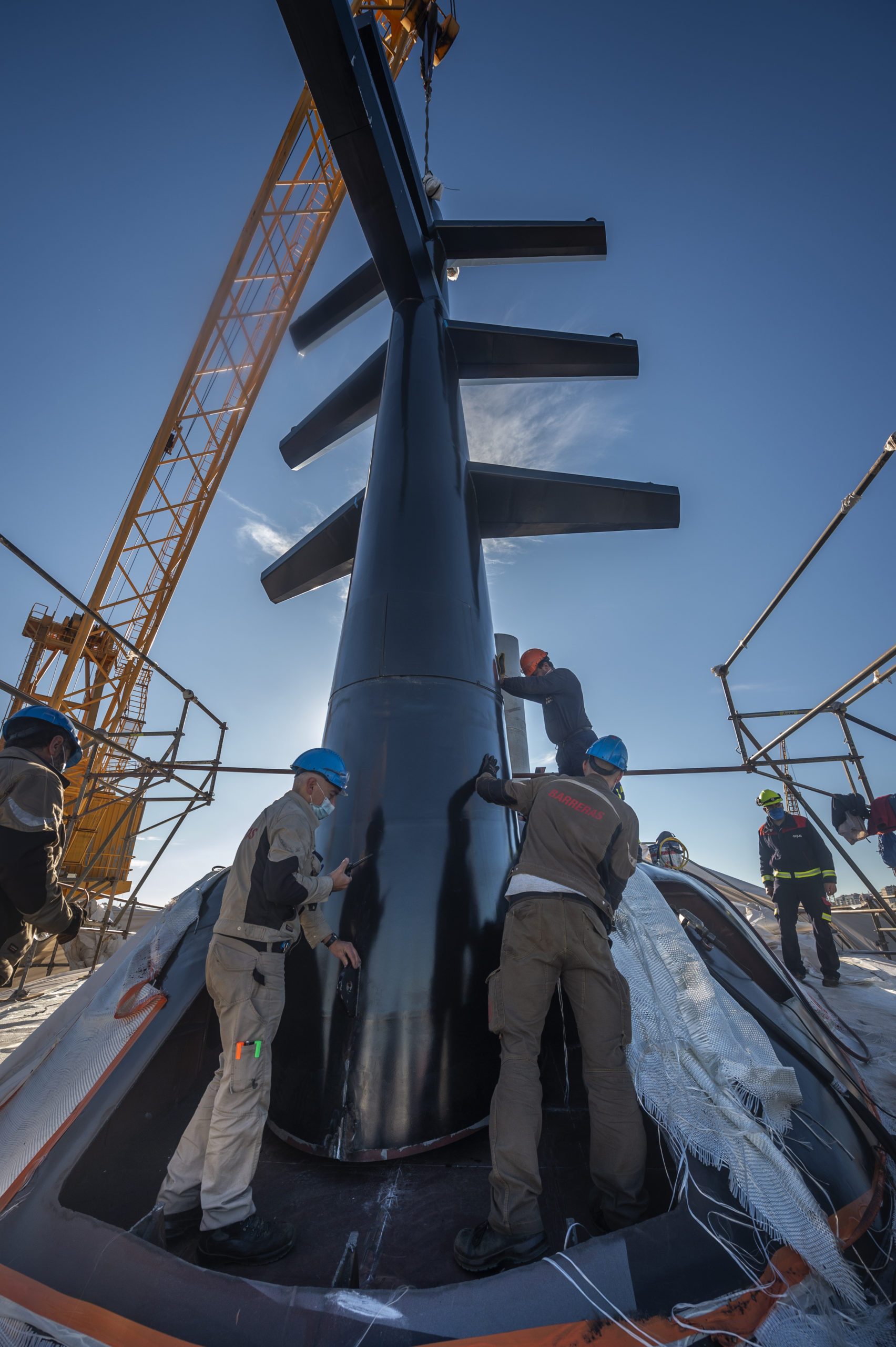 La colocación del mástil ha requerido del trabajo de decenas de operarios durante toda la mañana de hoy. Ha sido necesario el uso de dos grandes grúas para ubicarlo en su posición y mantenerlo erguido mientras se soldaba al casco. «En la actualidad, más de 1.000 personas trabajan a bordo del Evrima«, explica el astillero.