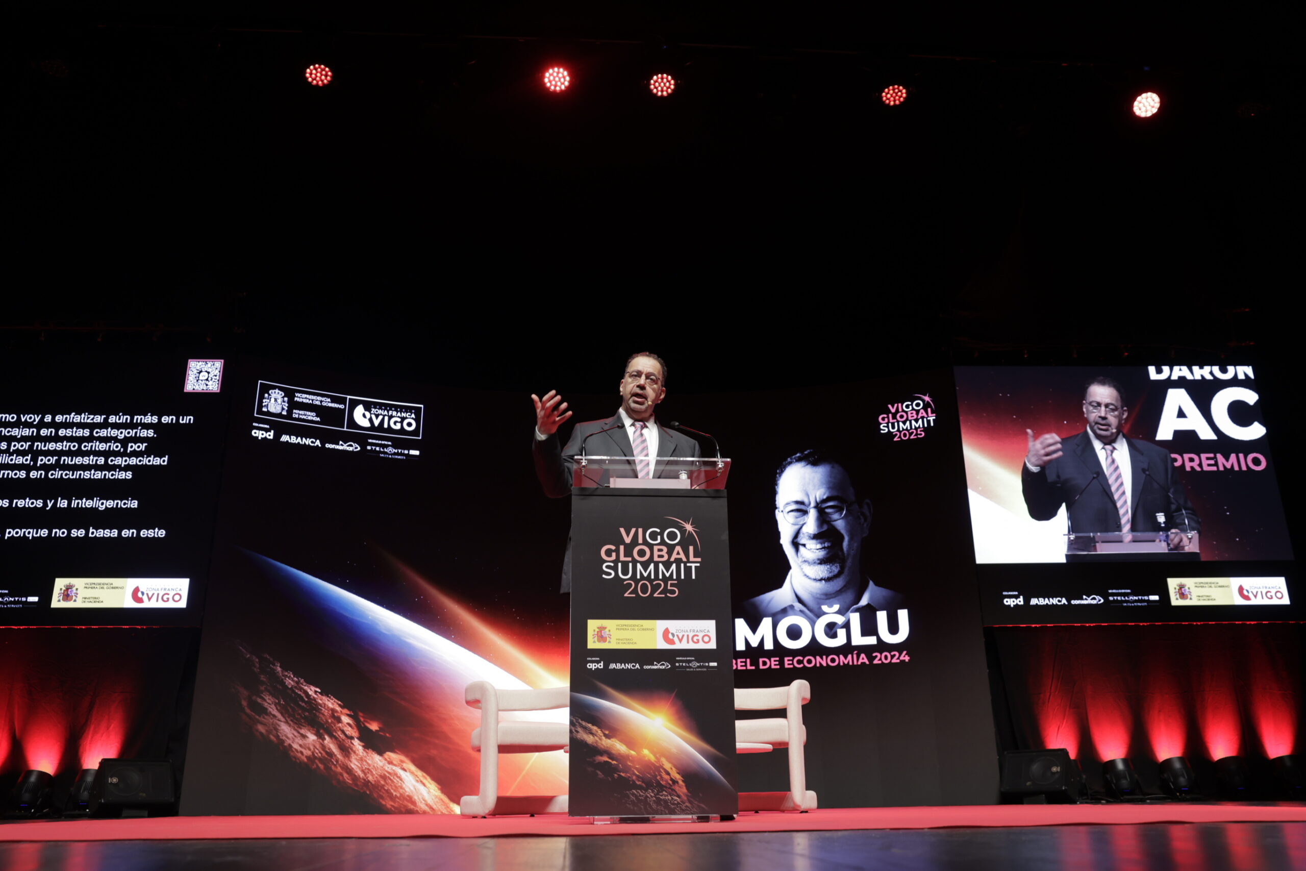 El Premio Nobel de Economía de 2024, Daron Acemoglu, fue el encargado de cerrar la segunda edición del Vigo Global Summit -que reunió a más de mil asistentes durante este miércoles y jueves en la ciudad viguesa-, donde ofreció una reflexión sobre el impacto de la Inteligencia Artificial (IA) en el empleo, la productividad y la desigualdad.