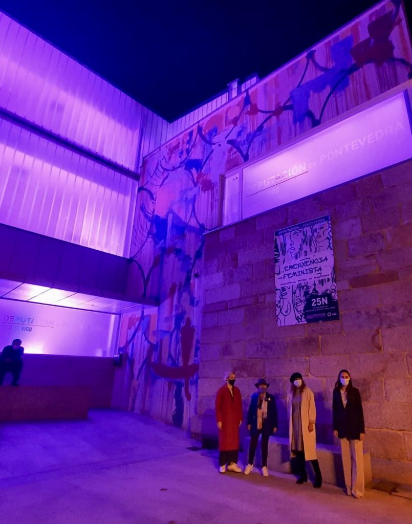 A campaña provincial arrancou coa instalación de dúas grandes pancartas despregadas nas fachadas das sedes da institución provincial de Vigo e Pontevedra. No acto da súa colocación celebrado esta mañá no Pazo Provincial, participaron amais de Carmela Silva o vicepresidente César Mosquera e deputados e deputadas do Goberno provincial. Amais, ambos edificios da Deputación iluminaranse en cor violeta desde a noite deste xoves ata finais de novembro, “como unha chamada de atención fronte ao que está acontecendo”.
