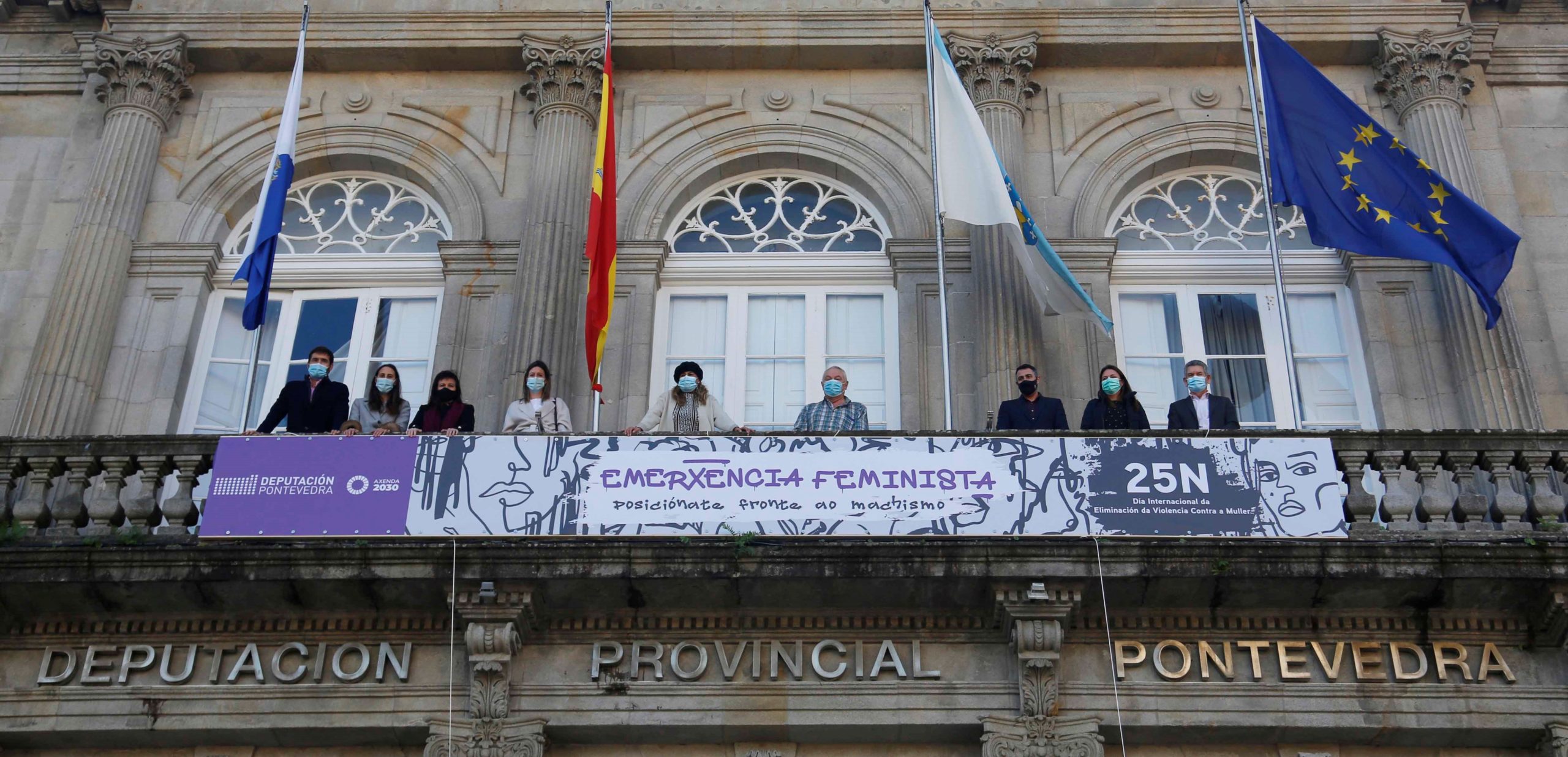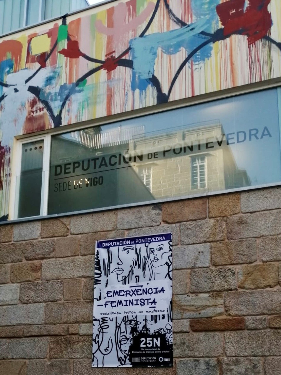 A campaña provincial arrancou coa instalación de dúas grandes pancartas despregadas nas fachadas das sedes da institución provincial de Vigo e Pontevedra. No acto da súa colocación celebrado esta mañá no Pazo Provincial, participaron amais de Carmela Silva o vicepresidente César Mosquera e deputados e deputadas do Goberno provincial. Amais, ambos edificios da Deputación iluminaranse en cor violeta desde a noite deste xoves ata finais de novembro, “como unha chamada de atención fronte ao que está acontecendo”.