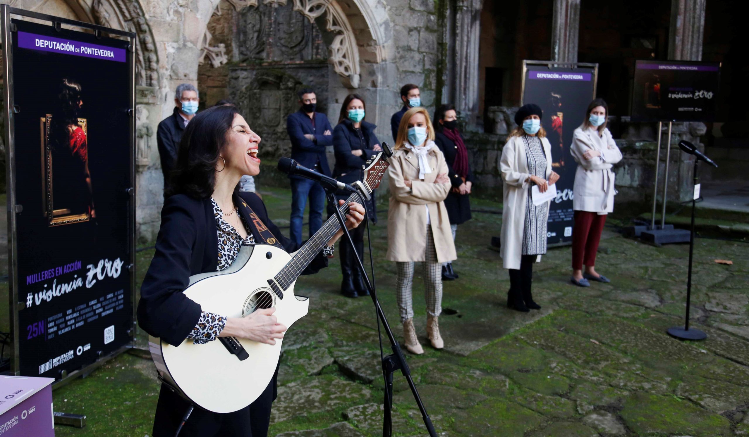 Trala colocación da pancarta, as Ruínas de San Domingos foron o “nobre” escenario escollido para dar a coñecer o resto da programación, que volve ter o proxecto “Mulleres en Acción. Violencia Zero” como estrela e “que chegará a todos os recunchos da provincia, aos centros educativos, ás prazas, aos espazos onde nos relacionamos, porque temos que educar e tomar conciencia e facelo no espazo público”. Precisamente, este acto contou coa actuación musical de Najla Shami, unha das artistas que vai participar e que, como destacou Carmela Silva, “pon voz e rostro a todas as mulleres da cultura que tanto aportan”. Neste senso, a presidenta indicou que ao termo do 2021 haberán sido 150 as protagonistas das accións de ‘Violencia Zero’. O lema nesta VI edición é “Emerxencia cultural, urxencia feminista” e contará de novo con 25 accións que se desenvolverán en 25 concellos de todas as comarcas a cargo de mulleres da cultura “que son o ariete fundamental para transformar, e poñen a súa creatividade para que algún día non teñamos que facer un 25N”. As dúas accións inaugurais serán performances e terán lugar o propio 25 de novembro na praza da Peregrina de Pontevedra, a cargo de Janet Novás, protagonista do cartel deste ano, e o día 26 no Museo Marco de Vigo con Mónica Aranegui.