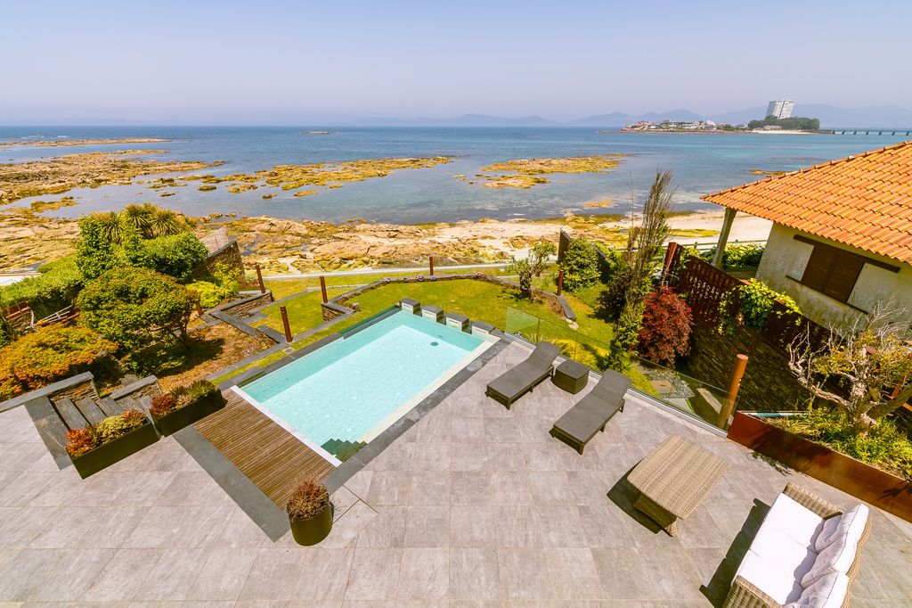 De reciente construcción, la fecha es del año 2020, destacan de la vivienda que se ha hecho con materiales y acabados de la «máxima calidad». En un terreno a pie de playa de 1.050 m2 con piscina y jardín y vistas a las Cíes y a la isla de Toralla, la casa principal tiene una superficie de 560 m2 que se distribuye en dos plantas.