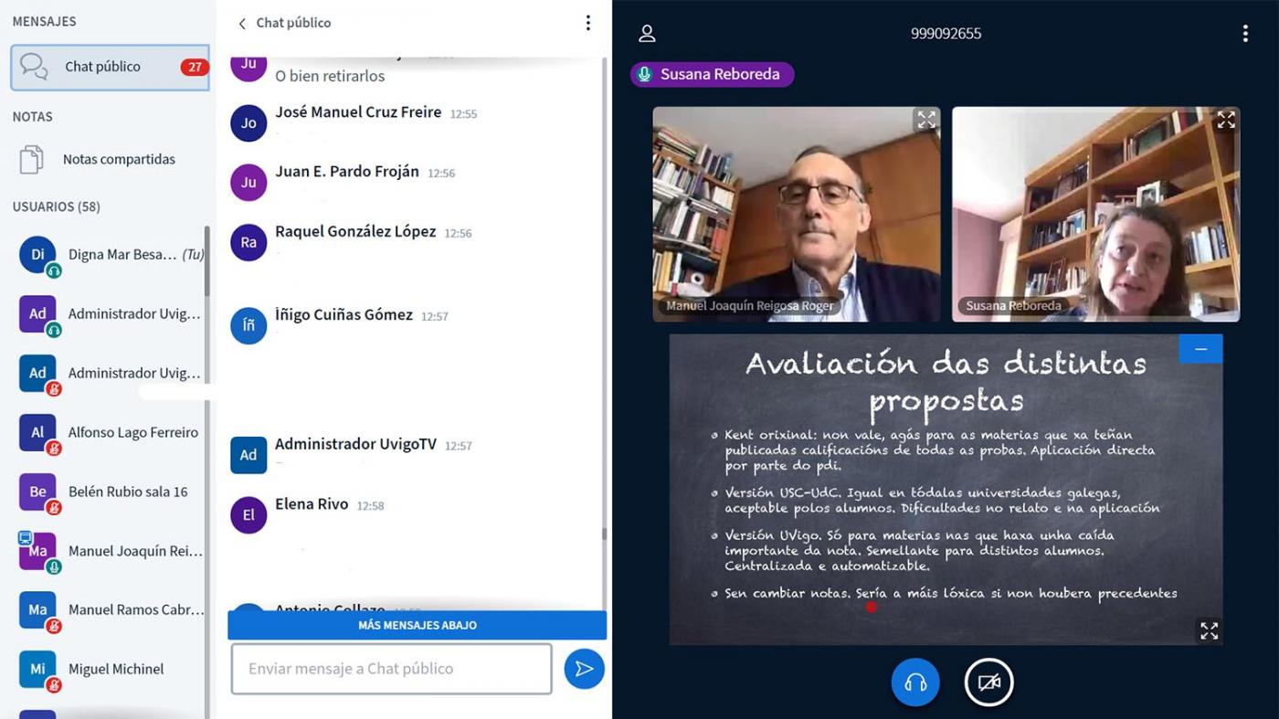 Aínda que o debate neste punto arrancou con dúas propostas diferentes, unha defendida polo equipo de goberno e a que lle incorporaron achegas xurdidas no debate, e outra por Ceuvi, finalmente o Consello de Estudantes asumiu os argumentos do equipo reitoral. Unha proposta “só para materias nas que haxa unha caída importante da nota, centralizada e automatizable”, asegurou o reitor, que a contrapuxo á adoptada na USC e na UDC, que asegura, “presentan dificultades no relato e na aplicación”. No debate previo, Daniel Couto incidiu na conveniencia de que se aplicasen as mesmas medidas nas tres universidades do SUG “para evitar desigualdades e que non esteamos en desvantaxe”. Pola súa banda, o director da EE Industrial lamentou que se presupoña que a avaliación non vai ser xusta e “que cómpre protexerse”, ao tempo que insistiu en que non se poden devaluar as titulacións. “Debemos ser éticos e responsables”, dixo Pardo Froján, mentres que Daniel Couto insistiu en que “cómpre ter mecanismos de corrección nunha situación así”, ao tempo que defendeu a súa legalidade.