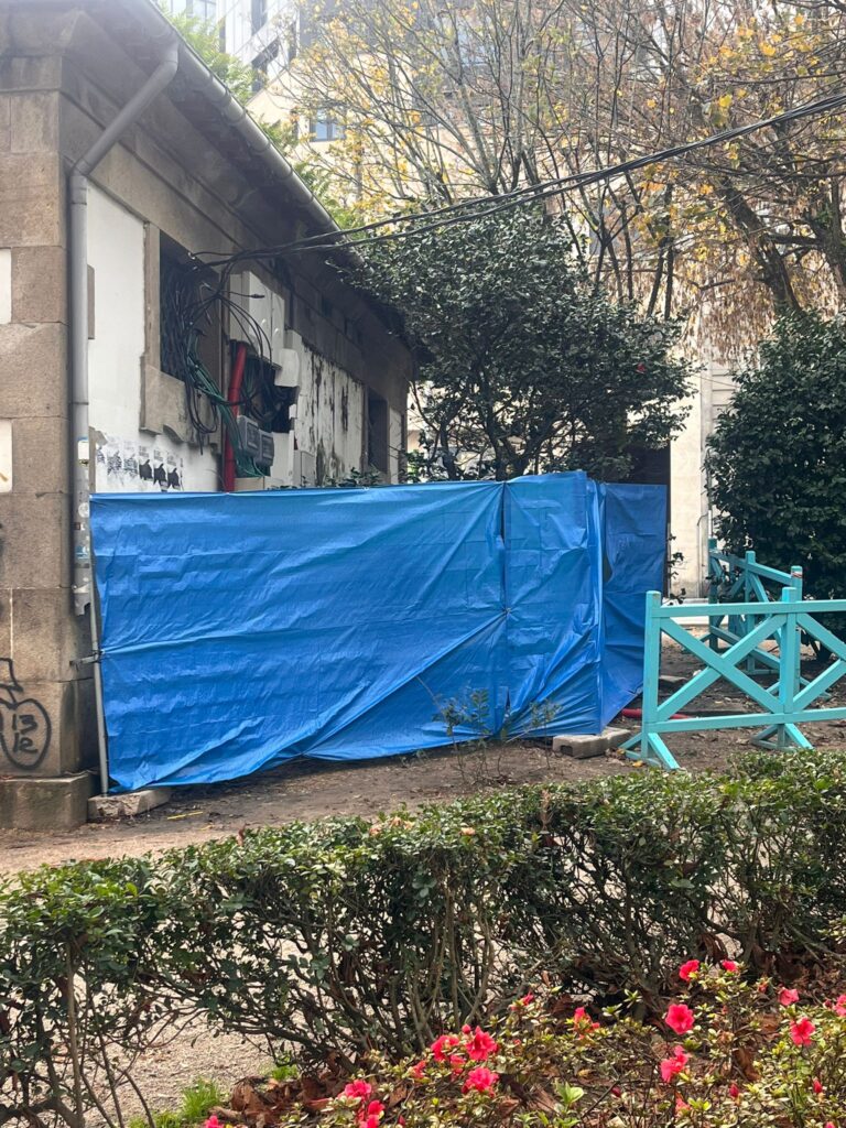 Pero eso mismo es lo que pasa en la Plaza de Compostela y que cualquiera puede ver con poner un poco de atención y a pesar de que en las últimas fechas el Concello ha desplegado una suerte de biombo de plástico delante del centro de transformación de Areal. Como si esconder la chapuza fuese a evitar lo que nadie quiere que pase. Un biombo pero ninguna rectificación, como denuncian los vecinos de la zona otra vez, porque esta queja no es nueva.