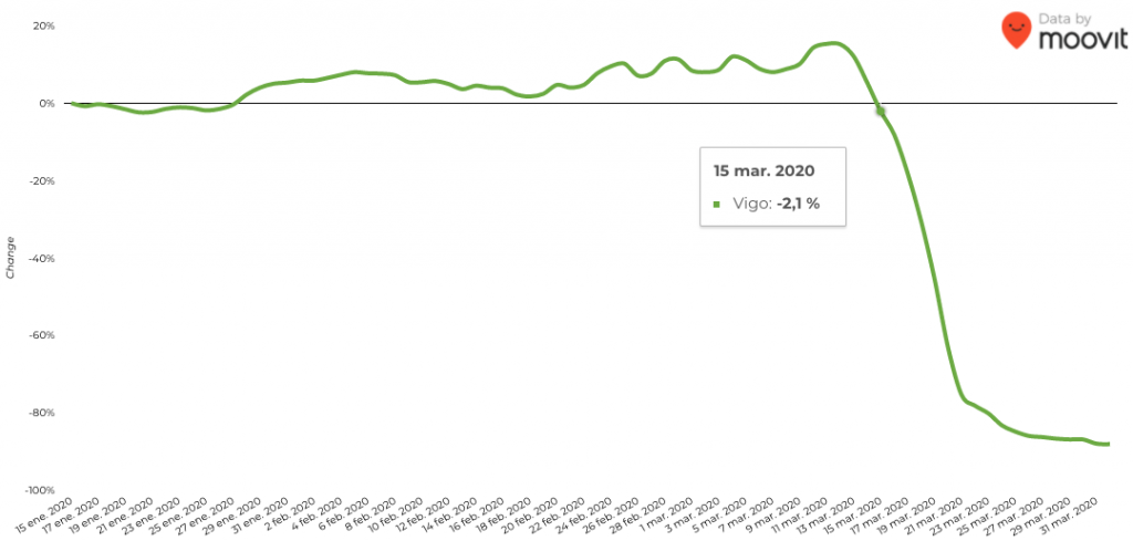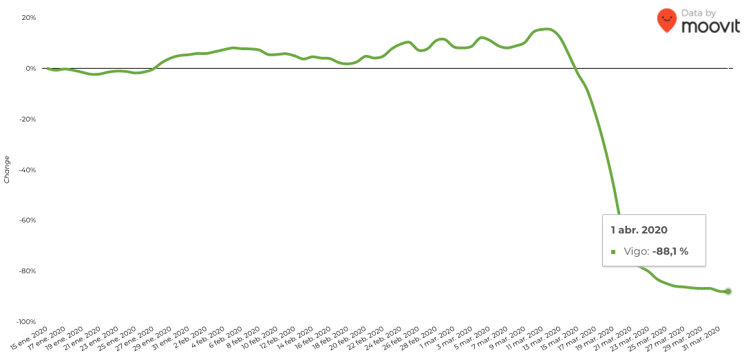 Atendiendo a estos los mencionados y comparando los datos de Vigo con otras ciudades españolas, la caída es relativamente tardía (no en vano los descensos generalmente se empezaron a notar entre el 12 y el 13 de marzo) y menos profunda. El descenso en la ciudad olívica ha alcanzado un 88,1% a 31 de marzo, por debajo de la caída registrada en otras ciudades como Burgos y Sevilla, con caídas del 91% y 90,8% respectivamente.