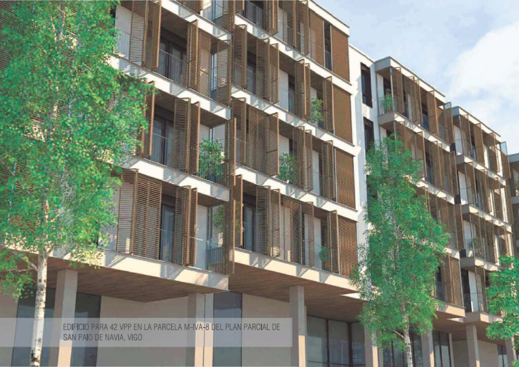 En la parcela conocida como MIVB25 -ubicada en la zona más metida del ‘viejo’ Navia, entre la rúa San Paio y cercano a la carballeira da Barroca,- se levanta este inmueble proyectado por la UTE conformada por los arquitectos Naos y Francisco Otero Méndez para contar con un total de 46 viviendas.