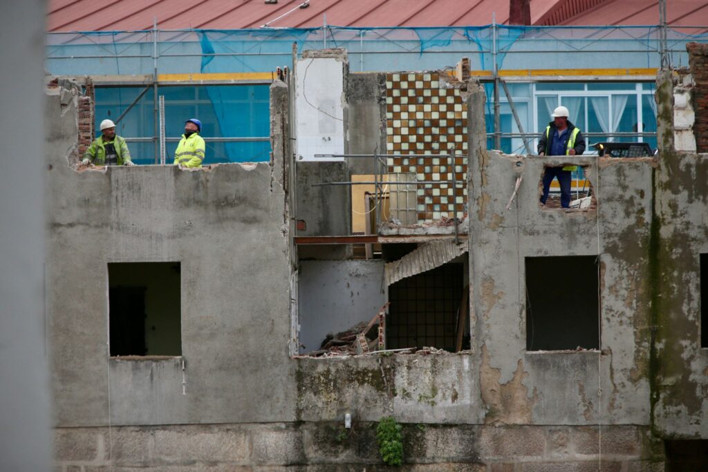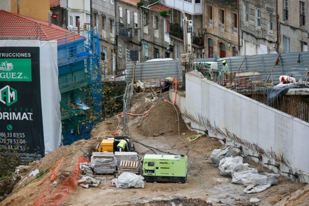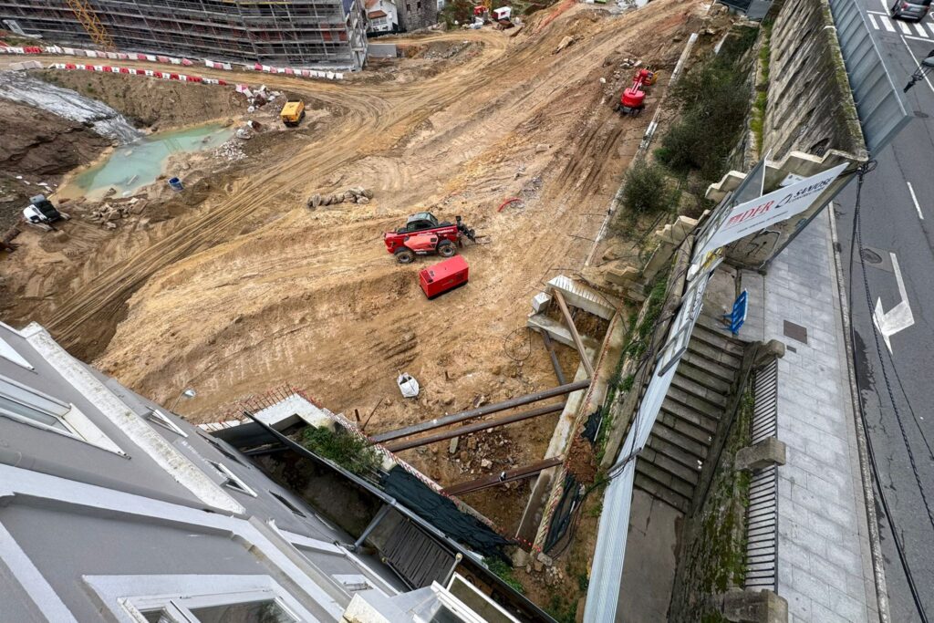 Por un lado, se aprecia a la perfección la base de las siguientes torres. Los cimientos de los edificios Lúa y Estrela se consolidan con la maquinaria a un ritmo frenético. Serán los edificios que cierren el barrio hacia las calles Santa Marta, Torrecedeira, Llorente e inicio de Pi y Margall.