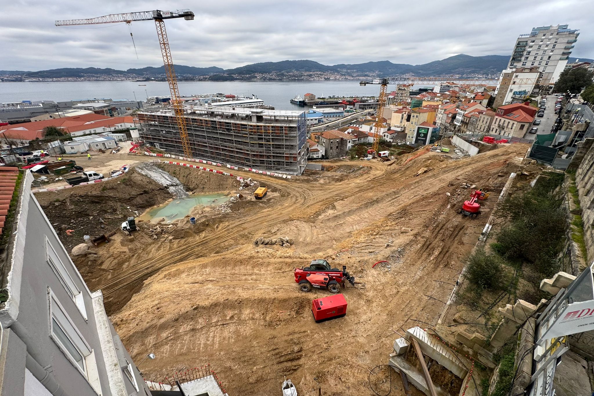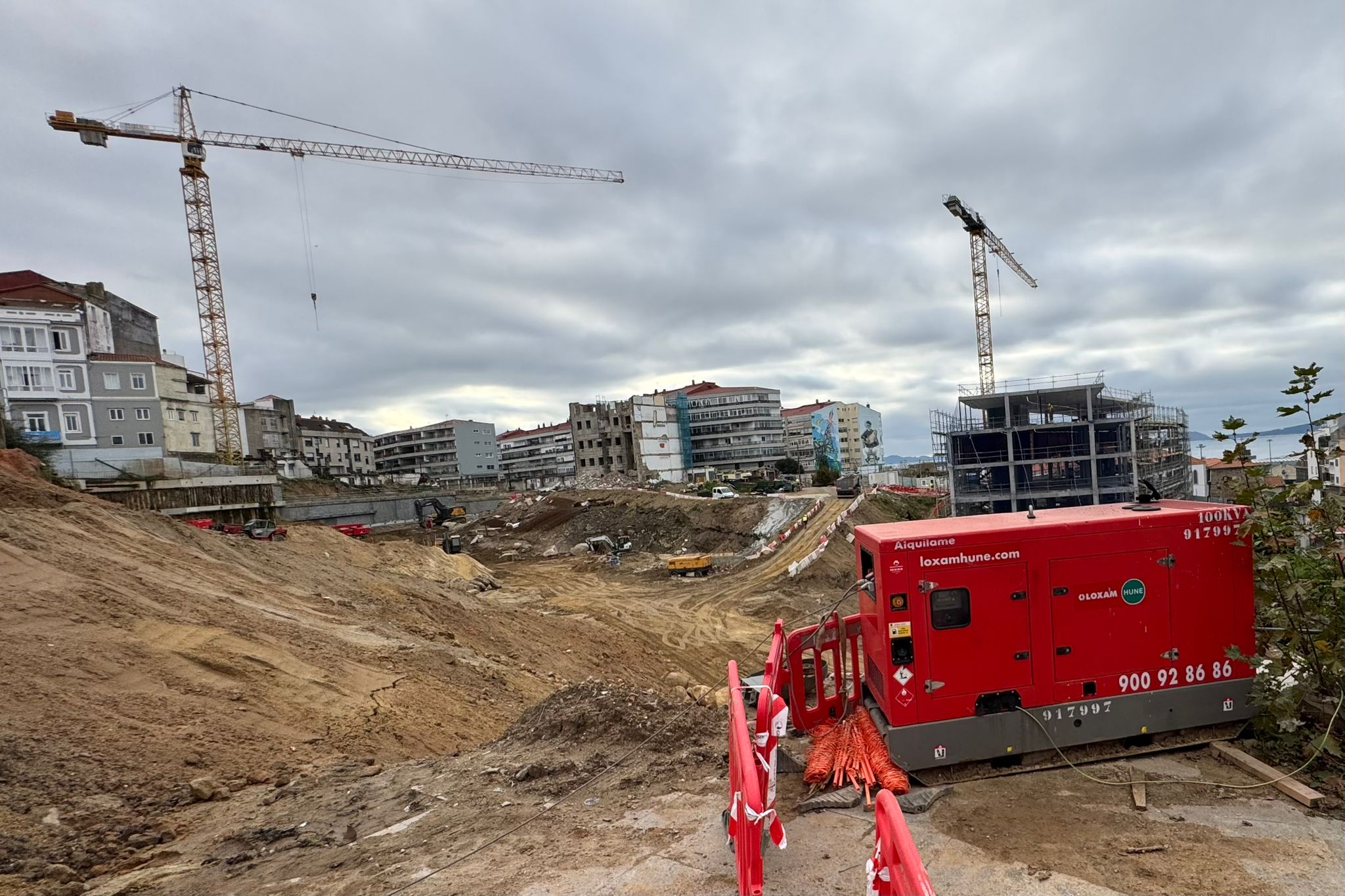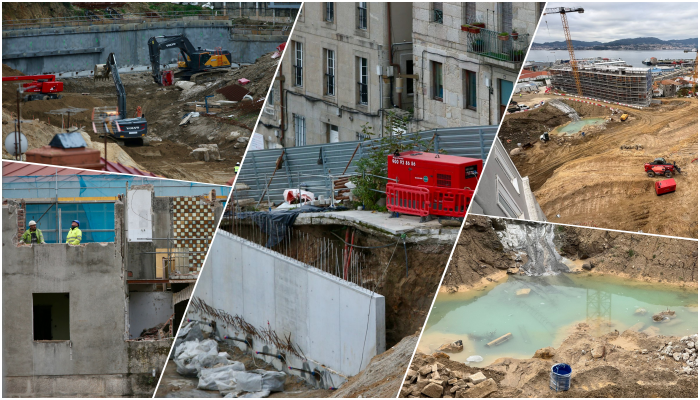 Por un lado, se aprecia a la perfección la base de las siguientes torres. Los cimientos de los edificios Lúa y Estrela se consolidan con la maquinaria a un ritmo frenético. Serán los edificios que cierren el barrio hacia las calles Santa Marta, Torrecedeira, Llorente e inicio de Pi y Margall.