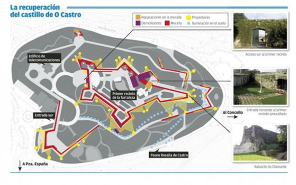 Así, se contemplan tres líneas de intervención: de conservación y recuperación de elementos propios de la fortaleza, de reorganización de la accesibilidad al monumento (puerta norte) y de mejora de la integración de la fortaleza en el paisaje urbano (iluminación y reestructuración de la masa vegetal circundante).