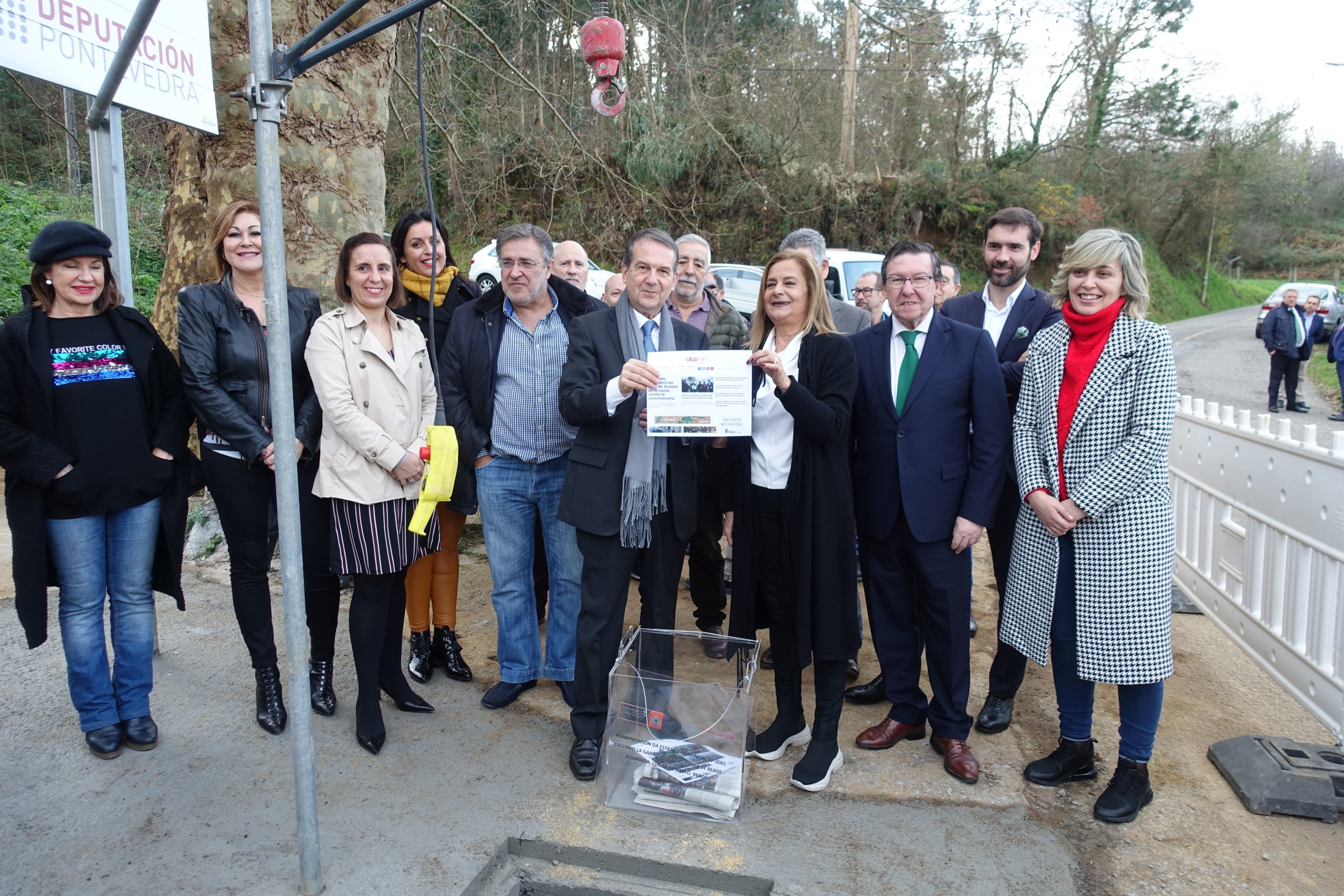 A Deputación de Pontevedra e o Concello de Vigo puxeron en marcha este venres a reforma da estrada provincial PO-2001, no tramo de 2,4 quilómetros comprendido entre o regato de Quintián e a rúa Ramiro Pascual, no lugar de Porto (Beade). O acto institucional, que consistiu no soterramento dunha ‘urna do tempo’ e que estivo presidido pola presidenta provincial, Carmela Silva, e o alcalde, Abel Caballero, deu comezo a uns traballos que se prolongarán durante 18 meses e suporán un investimento total de 3.457.000 euros.