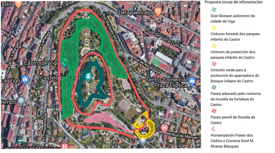 3. Reforestación do Parque do Castro para convertilo nunha gran área urbana verde. Construir un «Bosque Urbano de Vigo» no que se pranten árbores autóctonas e se realice unha restauración que convirta nun parque de referencia internacional dende o punto de vista medioambiental e cultural. Un gran bosque prantado por voluntarios no que creza unha gran carballeira e os nenos poidan observar especies autóctonas coma castiñeiros, bidueiros, pradairos, freixos, sobreiras, teixos e acibos. Especies que atraerán paxaros e fauna autoctona que ven desaparecendo da cidade nas últimas décadas: pardais, paporrubios, zorzais, verderóns ou andoriñas. Especies de árbores que devolverán a pasaxe de outono ós vigueses e viguesas, como ocurre en moitas ciudades europeas. Que podamos disfrutar dos ocres, bermellos e amárelos das follas do bosque autóctono. A proposta inclué a prantación de especies frondosas de porte mediano e de folla caediza polo paseo circular pola contorna da muralla do Castelo. Por último cinturones verdes de protección dos parques de xogos infantis e áreas biosaudables e no borde sur do aparcadoiro municipal de coches.