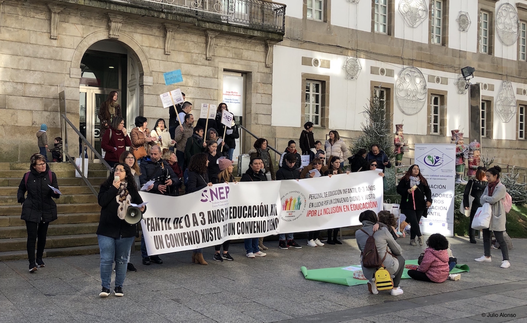 Los empleados de los centros privados de educación infantil en la ciudad de Vigo están reclamando un convenio justo para sus puestos de trabajo. En la fotografía, tomada el pasado sábado, día 11 de enero, podemos observar una concentración pacífica e informativa en la Rúa do Príncipe, en las escaleras del museo Marco.