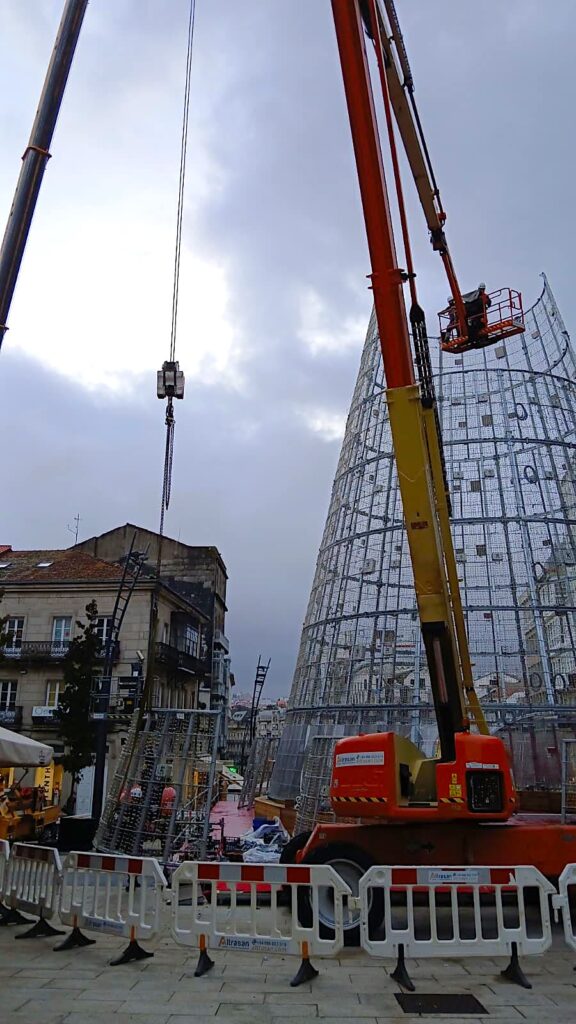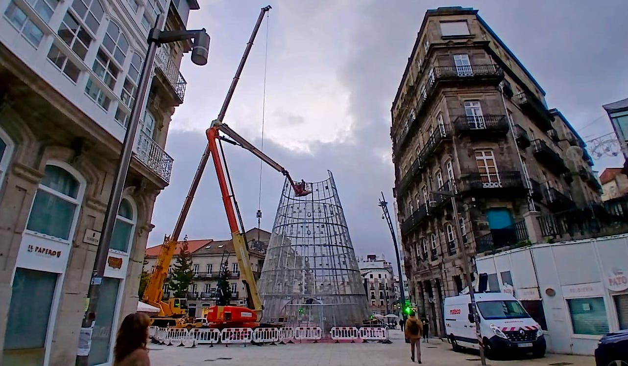Colocar el árbol, como sabe cualquier jubilado de los que disfrutan viendo a los operarios trabajar, es una labor tediosa, delicada y compleja. La grúa que hay en Porta do Sol, con un enorme brazo para que los operarios puedan alcanzar semejante altura, da fe de ello. Pero si todo avanza como es de esperar, es cuestión de un par de semanas que el árbol y los arbolitos que lo acompañarán durante los dos meses de fiesta, estén listos para sumarse al encendido general que, probablemente, tenga lugar el 15 de noviembre.
