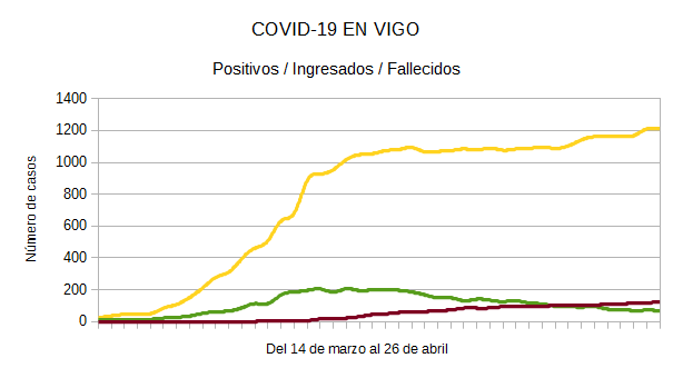 En el total de los ingresados, hay 18 en UCI (2 en Vithas Fátima , 6 en Povisa e 10 en Cunqueiro), uno menos que el sábado. A día de hoy ya se dieron 380 altas y hay cinco fallecidos más, uno en Domusvi Barreiro, por lo tanto son 123 los fallecidos.