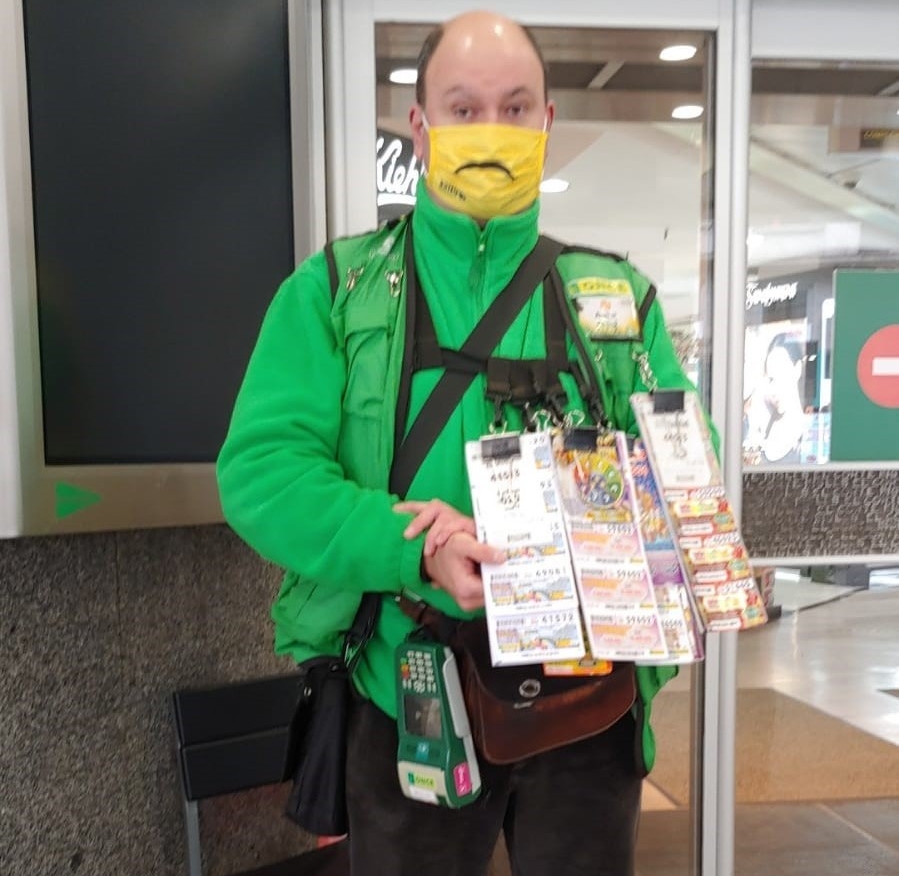 Alberto Fernández, de 45 años, padece una ceguera prácticamente total y vende los productos de juego de la ONCE desde hace 15 años. En ese punto de Gran Vía con Ecuador lleva diez años ininterrumpidos, lo que, según dice, “aunque es una zona por la que pasa mucha gente tengo una clientela habitual muy fiel y estoy feliz de haberles dado premio. Ojalá fuesen más”.