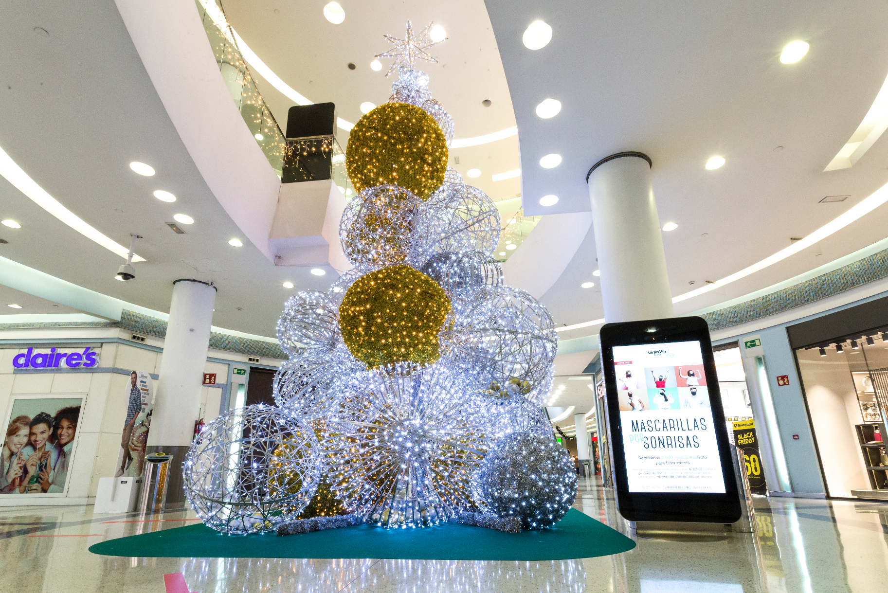 El Centro Comercial Gran Vía de Vigo inicia la temporada navideña con el encendido de su árbol de 8 metros de alto y de todas las luces repartidas por sus tres plantas comerciales. La decoración festiva de este año está compuesta por 500 metros de luces LED, más de 100 guirnaldas, 800 metros de elementos navideños aéreos y árboles ambientales a juego.