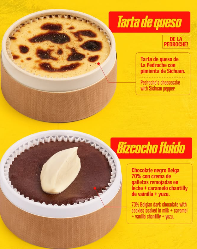 Y para acabar, dos postres: la tradicional tarta de queso de La Pedroche con pimienta de Sichuan y el espectacular bizcocho fluido, hecho con chocolate negro belga al 70% y crema de galletas remojadas en leche, caramelo ‘chantilly’ de vainilla y ‘yuzu’.