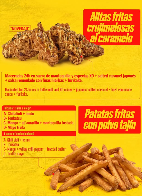 De hecho, ofrecerá tres opciones diferentes con pollo hipercrujiente, todas ellas novedades del mejor chef del mundo del mismo modo que ofrecerá en Madrid, además de sus tradicionales y exclusivas patatas fritas con polvo tajín así como dos variedades de postres.