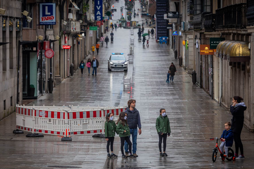 Podían salir los niños menores de 14 años a la calle, acompañados por un progenitor por supuesto, pero pocos fueron los que se animaron a asomarse en Vigo. Las 34 calles peatonalizadas por primera vez este Primero de Mayo no fueron suficientes para convencer a los vigueses. Y es el que tiempo, con cielos cubiertos todo el día y la lluvia persistente, dejó de nuevo una ciudad desierta.