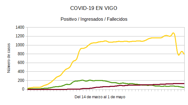 El área sanitaria de Vigo lideró este viernes, 1 de mayo, el descenso de los pacientes activos por coronavirus en Galicia. Según informó la Consellería de Sanidade, hay 70 pacientes activos menos, 9 hospitalizados menos y también 48 menos en domicilio. La cifra de ingresos en las UCIs de los centros médicos vigueses no varía y hay que sumar 93 curados más.