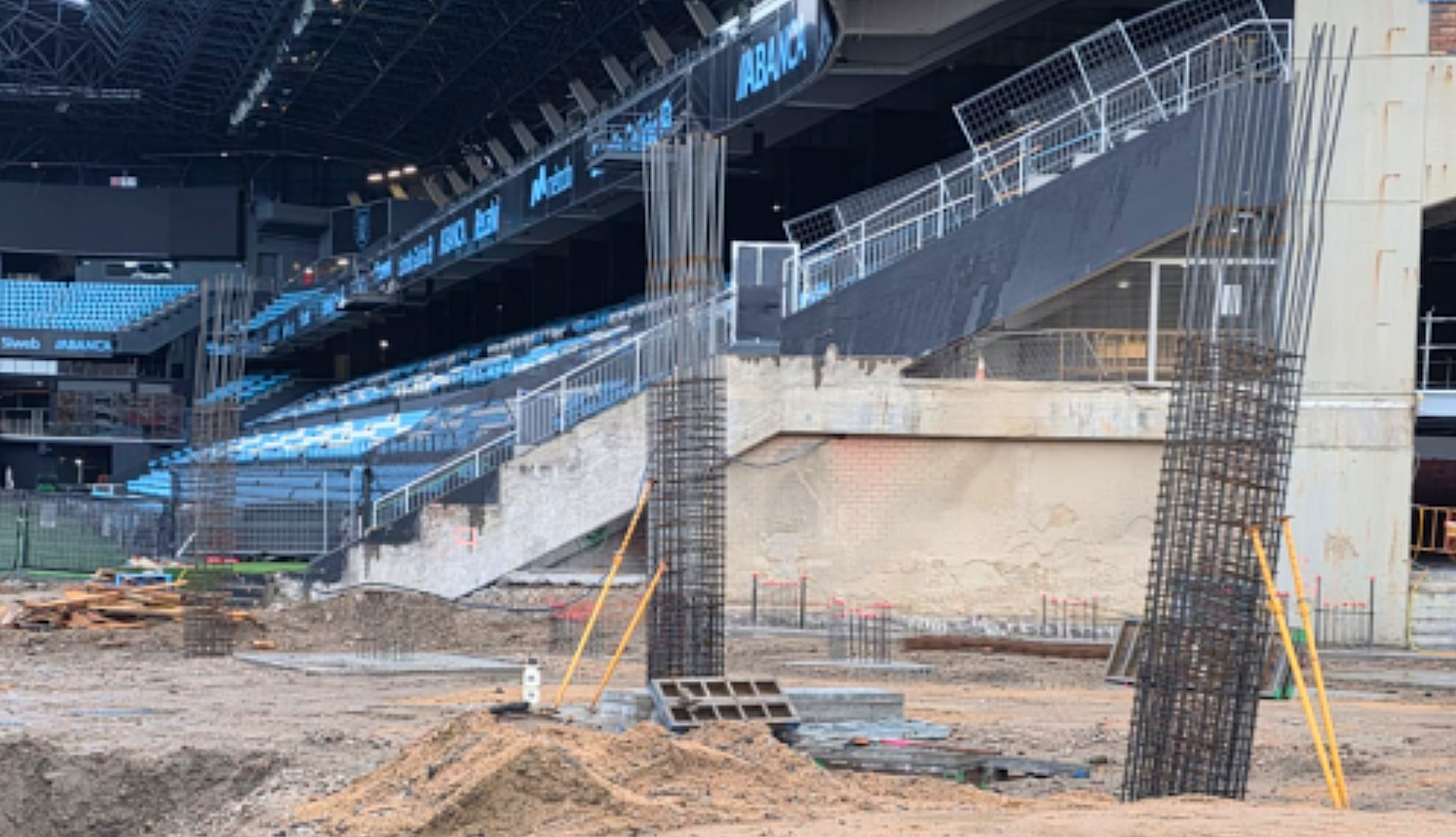 Instalados los primeros pilares que sostendrán la grada de Gol